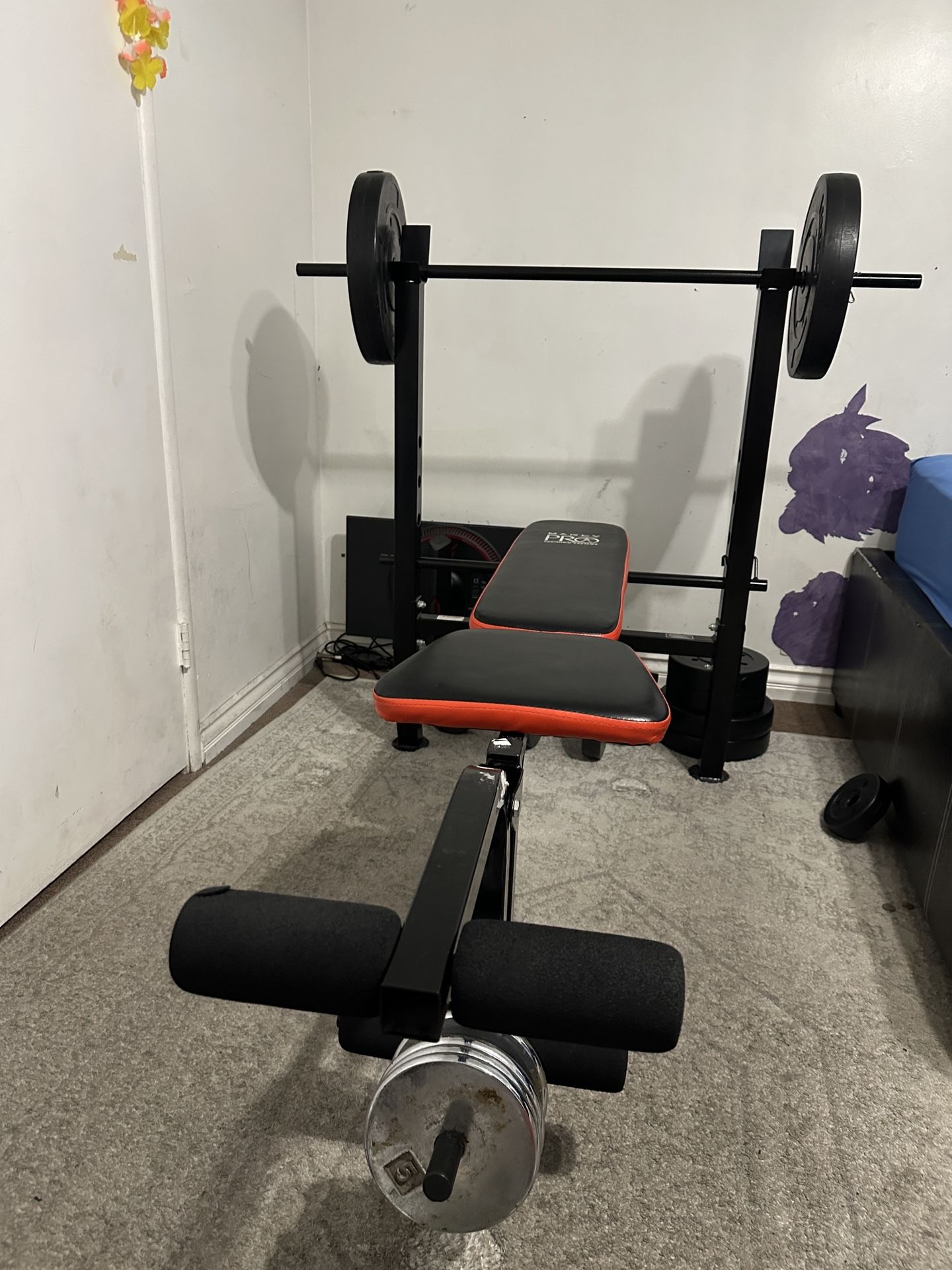 Used gym set. Includes a bench (which you can change the incline) barbell with different weights 25, 15, 5,2.5 lbs And two dumbbells Still in good condition. Pick up only