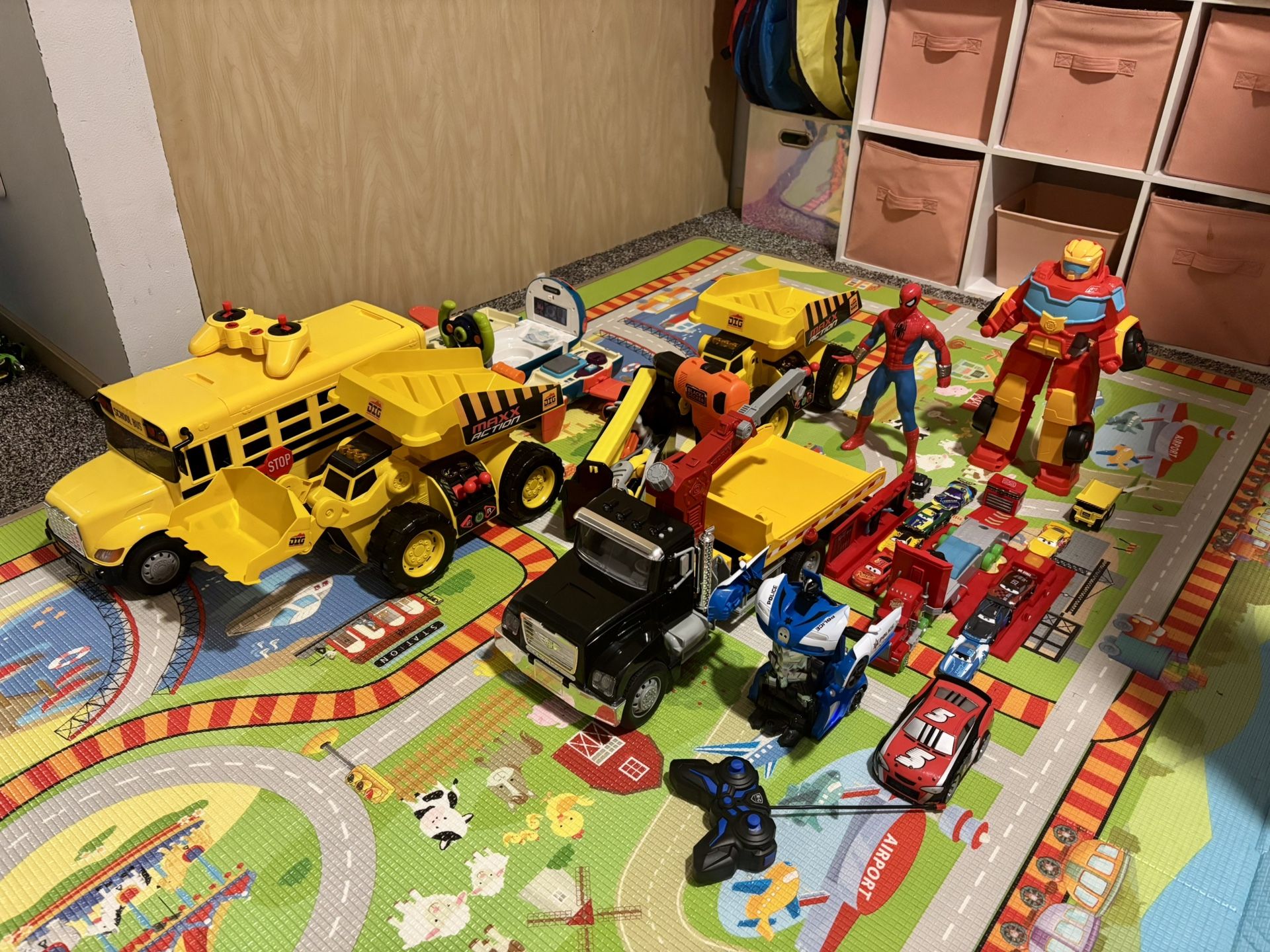 Selling a large bundle of kids toys — everything shown in photos is included. Includes: • Construction trucks & dump trucks • Large school bus • Tow truck & car carrier • RC police race car (runs and drives – missing some wheels) • 20+ die-cast cars • Wooden building blocks • Magnetic tiles • Tool set • Action figures • Play mat INCLUDED All toys are used in a clean environment and in overall good playable condition . Some pieces may be missing small parts (as shown in photos), but everything is still great for play. The RC car still powers on and drives. Perfect for toddlers or young kids — great starter bundle or extra toys for grandparents’ house.