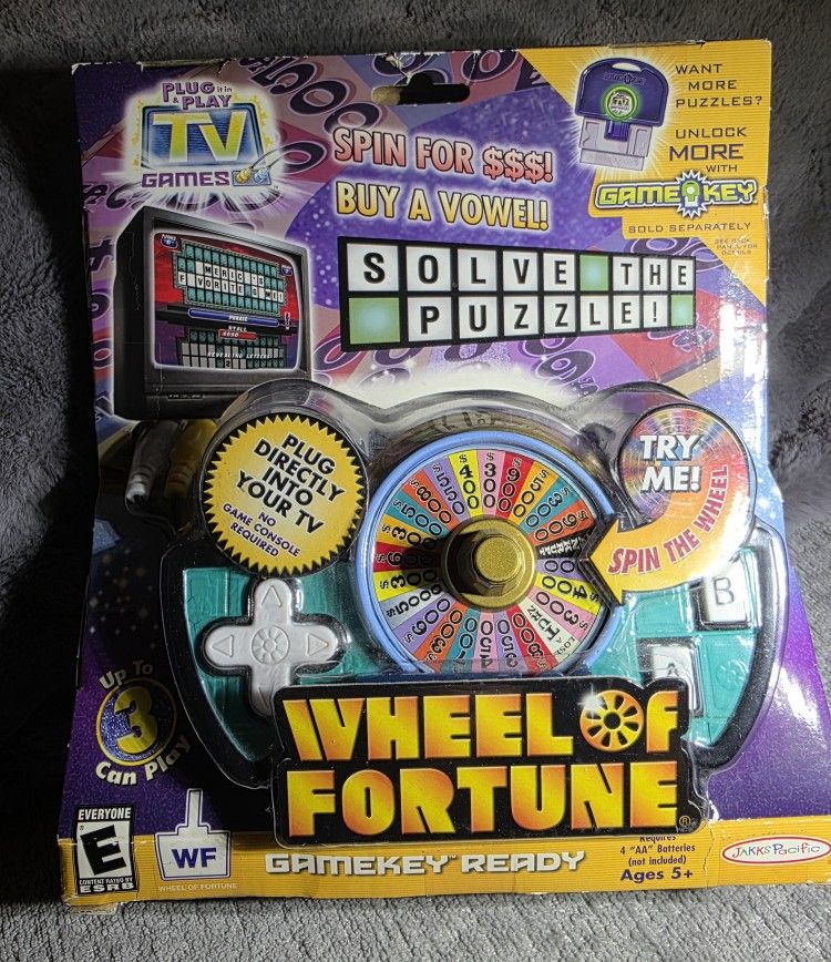 Wheel of Fortune Plug & Play TV Game This standalone system plugs directly into a television, allowing players to spin the wheel and solve word puzzles without needing a separate game console. Key product information: Manufacturer: Jakks Pacific Features: Includes a physical spinning wheel controller and plugs directly into a TV. Content: Features over 700 puzzles across various categories, written by the show's staff. Modes: Offers single-player and multiplayer modes for up to three people. Rating: Rated E for Everyone, suitable for ages 5 and up. Brand New/Sealed Box