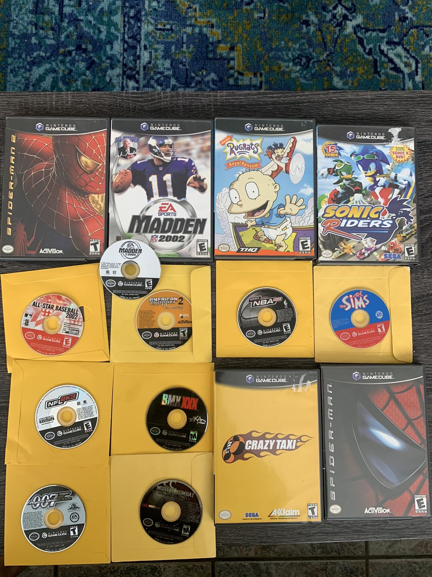 Nintendo gamecube games Spider-Man -$20 Spider man 2- $20 Rugrats -$15 Sonic riders -$30 Crazy taxi -$35 Bmx xxx- $25 Agent under fire 007 - $25 Mortal kombat deadly alliance -$30 American chopper 2 full throttle -$15 All star baseball 2002 - $10 NFL 2k3 -$10 The sims -$30 Madden 2002 -$10 Madden 2005 -$10 Nba 2k2 - $10 Nintendo Game cube video games