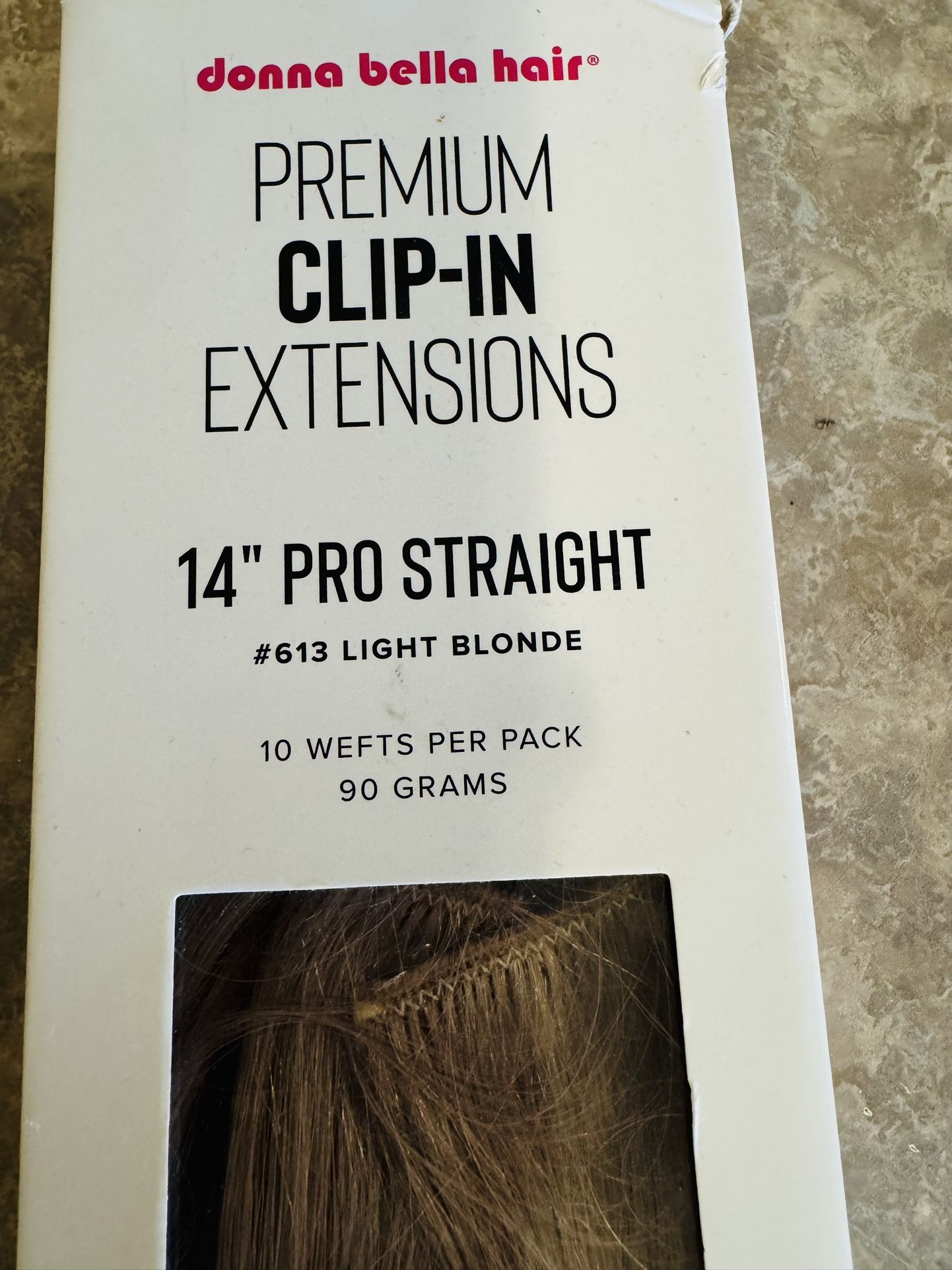 14” clip in extensions #613 light blonde 100% Human hair I did put purple shampoo on them to match my hair more so they are a bit more of an ashy blonde but it does wash out. Only used once my hair was still too short for 14” extensions.