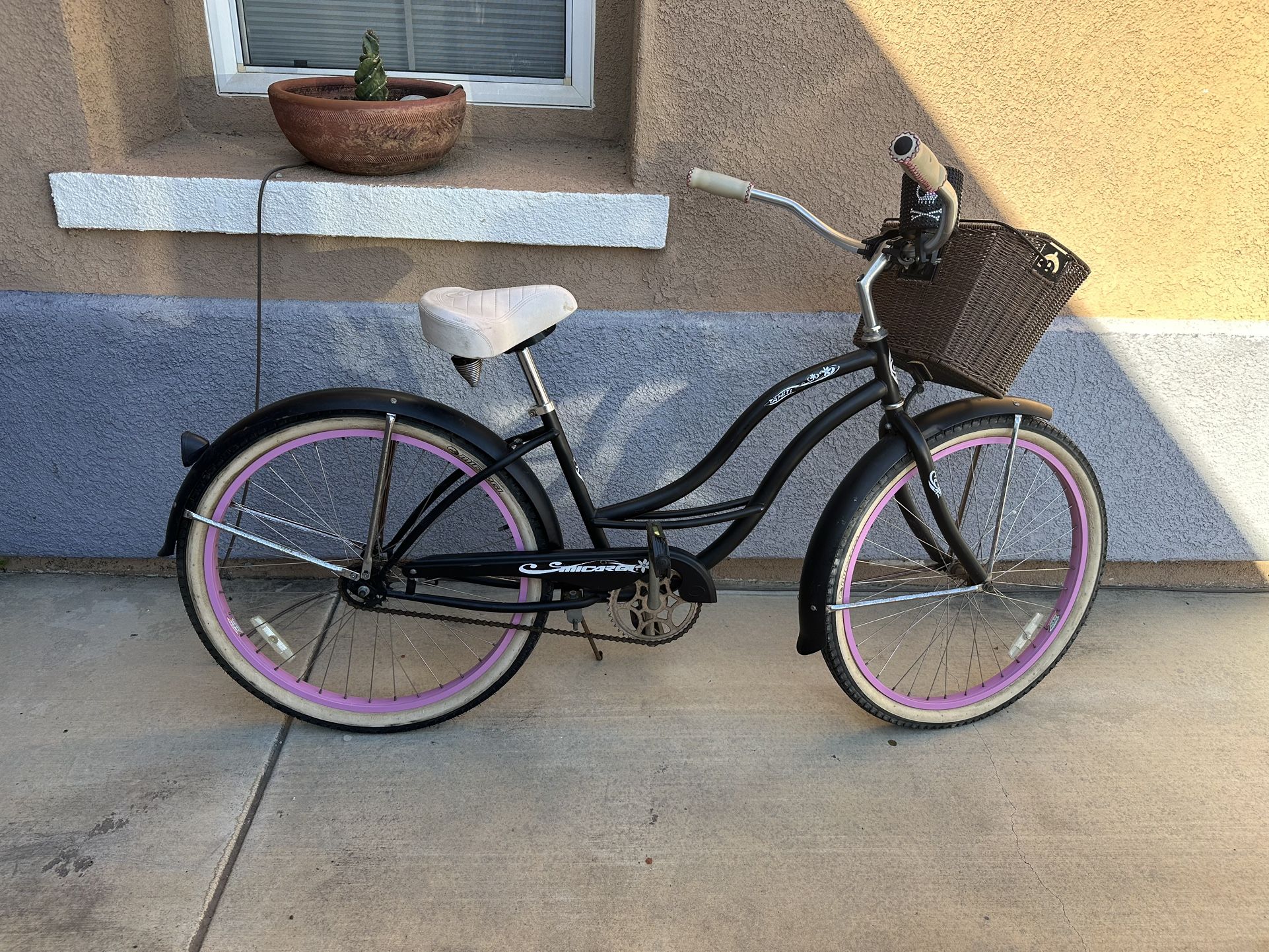 Perfect for the beach and riding down the road. The black and pink color combo helps you do it in style π. A basket to put your things and a cup holder for your favorite cruising refreshment.