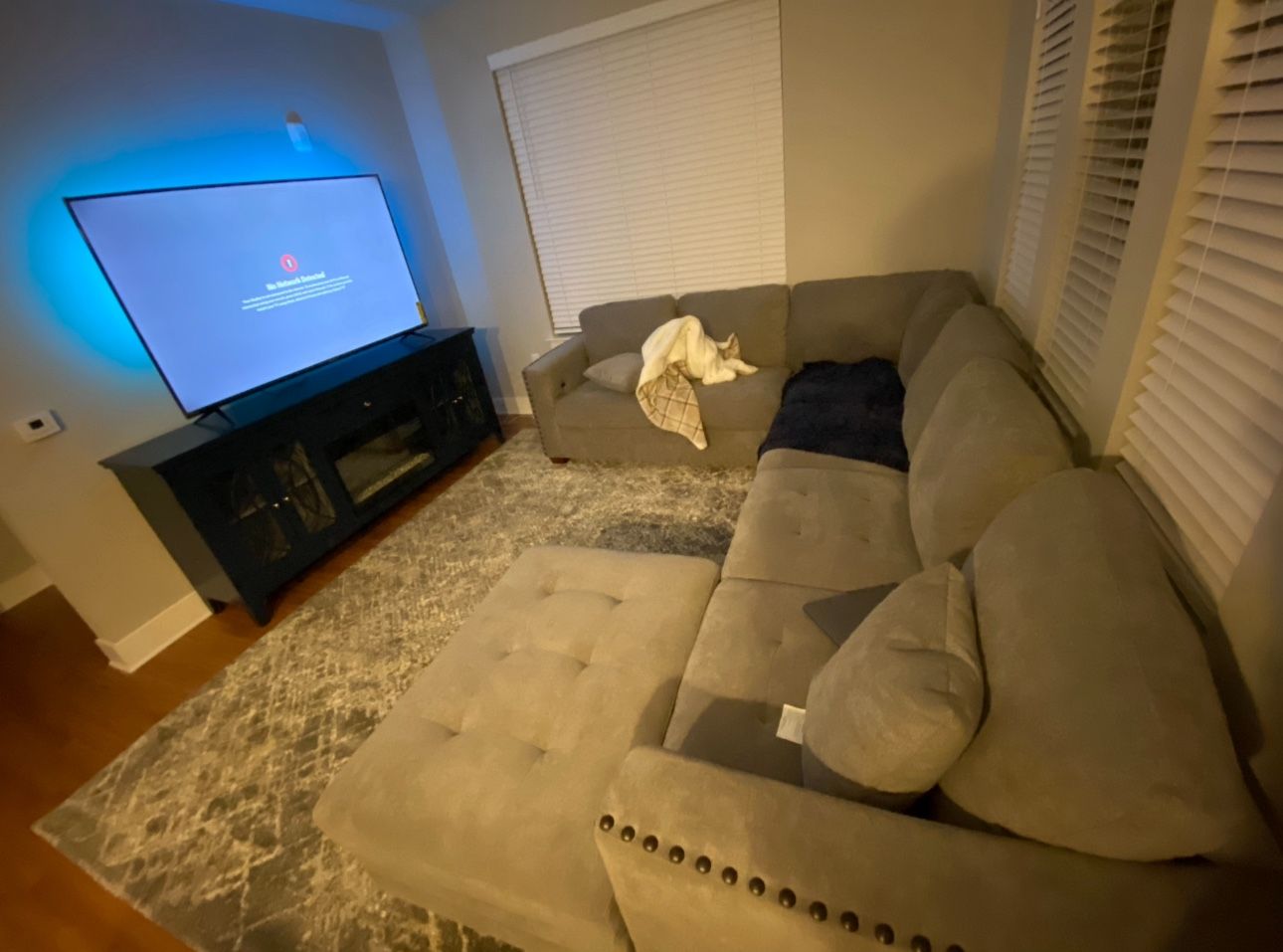 Gorgeous Miles sectional with large ottoman with storage. Plush, deep seating in soft gray fabric. Like new condition — no stains, tears, or sag. Smoke-free home. USB connectors