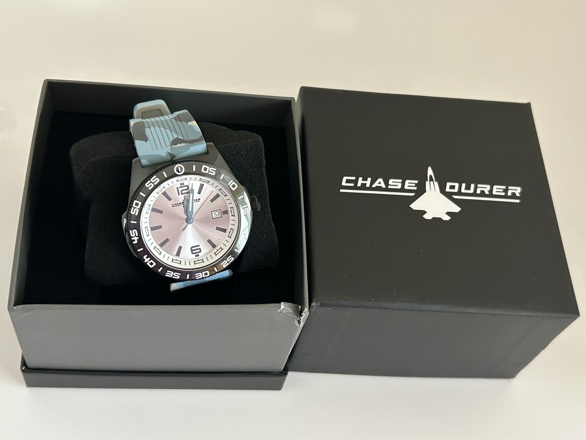 Brand new. First come, first served. Pickup in Kearny. Chase Durer CDW-0172 men's quartz watch with a blue camouflage band. Model: CDW-0172 Movement: Quartz Case Size: 45mm Case Material: Stainless Steel Band Material: Silicone Water Resistance: 50 meters (5 ATM)