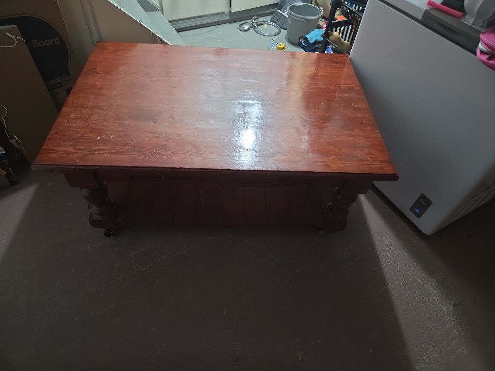 A solid wood coffee table from Ethan Allen, , stripped and restrained cherry color , , beautiful with 2 drawers for storage .it is in a very good condition.
