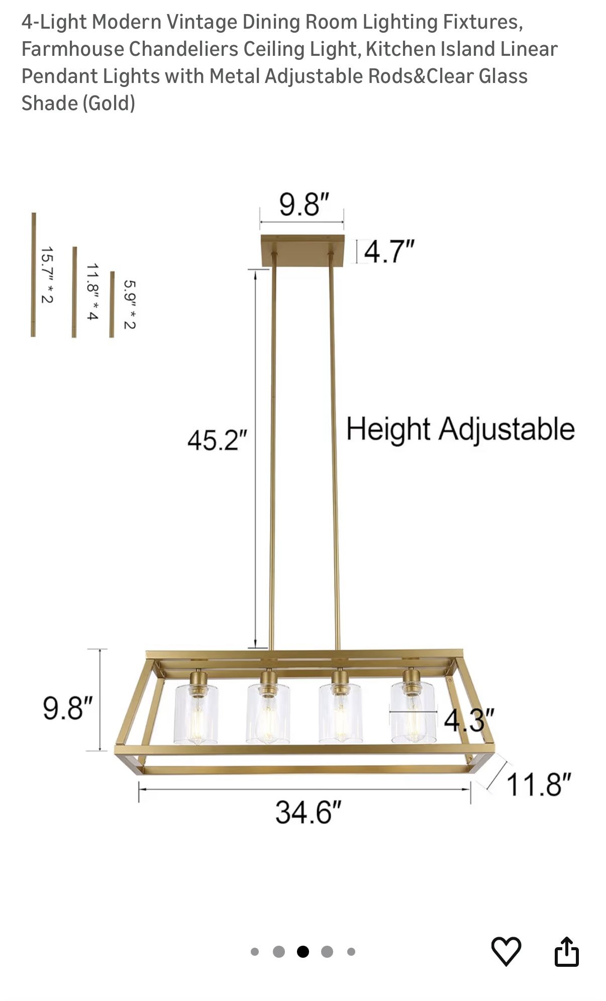 Brushed gold and Brand new in box. Farmhouse Chandelier Ceiling Light Kitchen Island Linear Pendant Lights with Metal Adjustable Rods and Clear Glass Shade (Gold) Height is adjustable. Dimmable