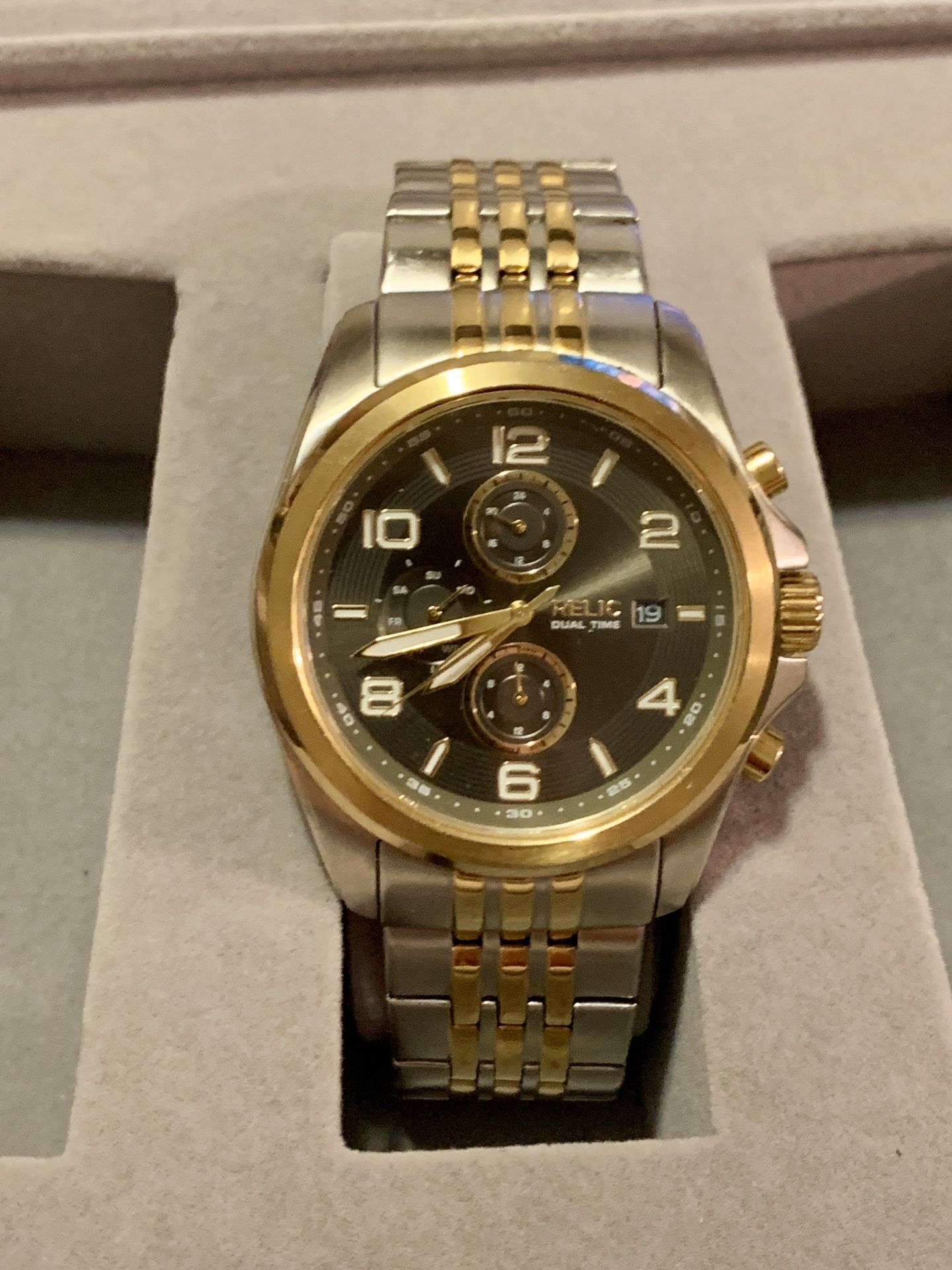 Grab this stunning Relic watch by fossil. No scratches to crystal or anywhere on watch. This watch is in excellent condition and practically like new. Brand new battery was just placed and is running great. Sold as is. Case size: 45mm; Band size: 24mm; quartz movement with luminous 3-hand analog display; mineral crystal face; imported. Two tone stainless steel case with black textured dial. Stainless Steel band with stainless steel butterfly clasp closure. Dual time display; calendar; date window; day subdial. Water resistant to 165 feet (50 M): suitable for short periods of recreational swimming and showering, but not diving or snorkeling.