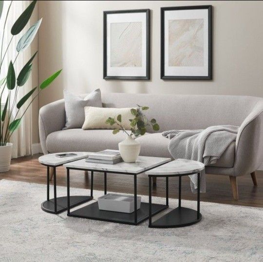Grace your space with an elegant nod to minimalist, contemporary, interiors tables with this three-piece coffee table set. Whatever your interior style, this trio is bound to effortlessly enhance your living room, home office, or personal sanctuary with its sturdy, open-box base and luxe-looking calacatta faux marble tabletop. Use the bottom shelves to store cozy knit blankets or cocktail supplies. Debut the three as a group and push them together to form a large occasional table, or separate the set and use the smaller pieces as end13.75'' H X 43.39'' W X 21.63'' D