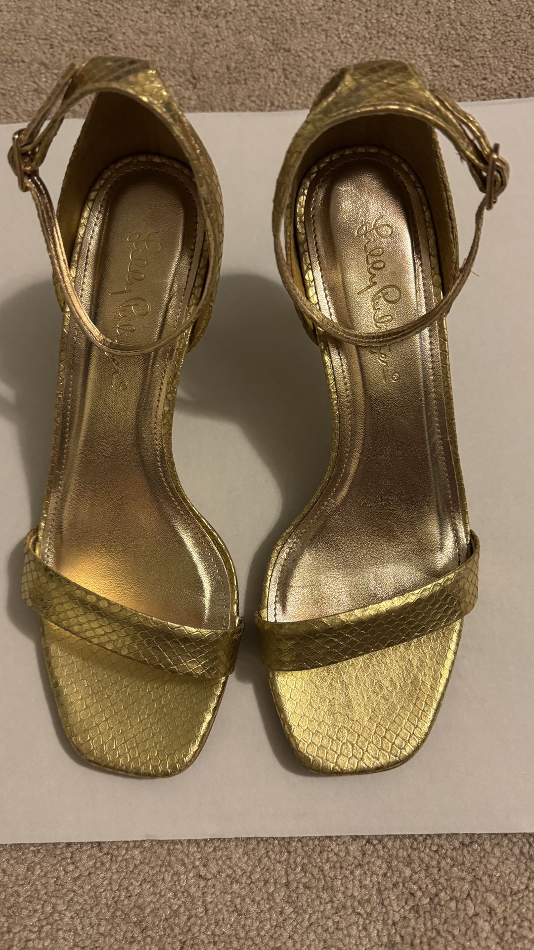 Step out in style with these gold sandals. Perfect for any occasion, these shoes offer both comfort and sophistication. Dress up or down with these Lilly 3-inch, size 8 heels, which have been worn once and are in excellent condition.