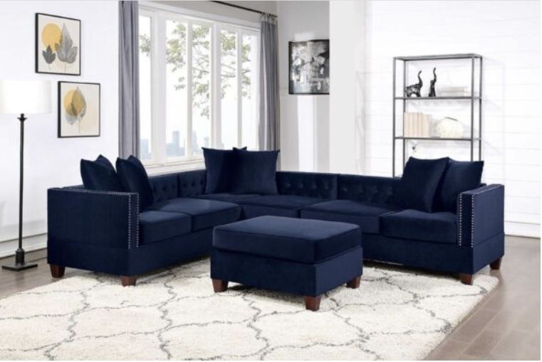 Sectional Sofa with Ottoman Item # 484 Color: Indigo Material: Velvet Dimensions: Sectional: 116″W x 92″L x 27″H Ottoman: 34″ x 29″ x 18″H Available in Black and Indigo Some Assembly Required Includes: F8943 X 3 Chaise Lounge + F8944 X 1 Ottoman
