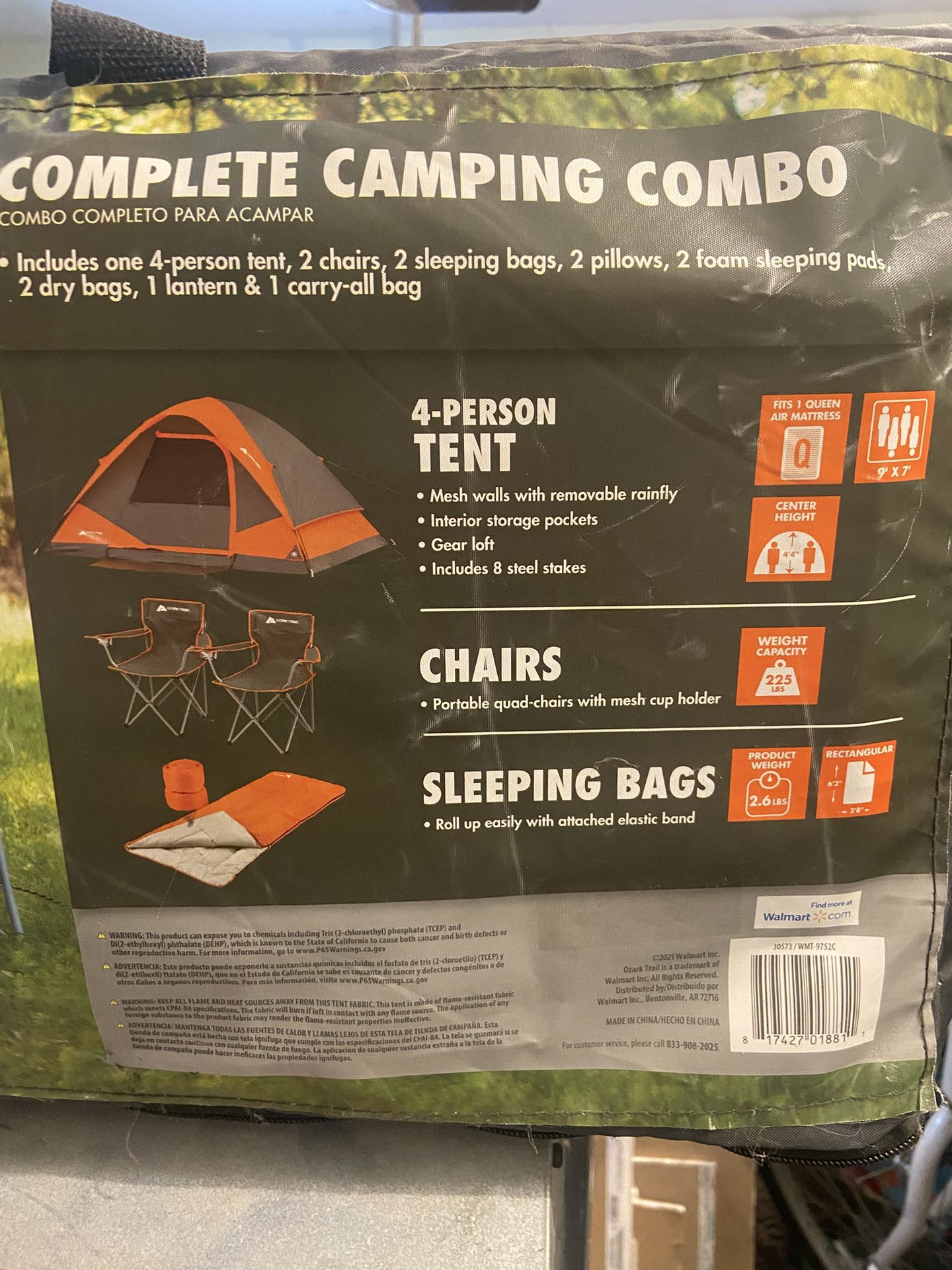 The whole brand new set up is ready to take someone on a camping adventure. 2 chairs with cup holders 2 sleeping bags, 2 dry bags, 2 pillows, 2 foam sleeping pads, 1 lantern, 1 four person tent . Great Christmas gift for anyone who loves camping