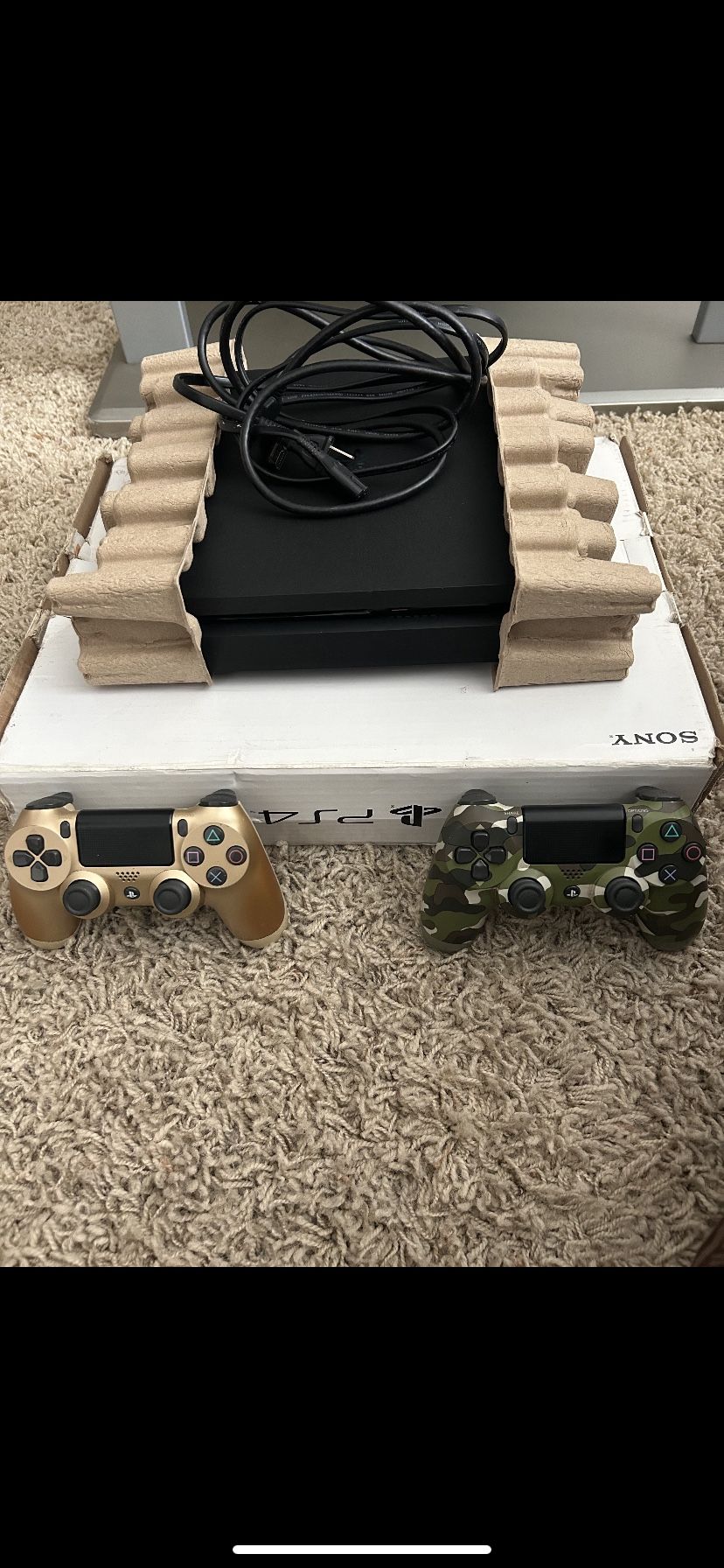 PlayStation 4 comes with two controllers one gold the other army green also all connection wires included as well