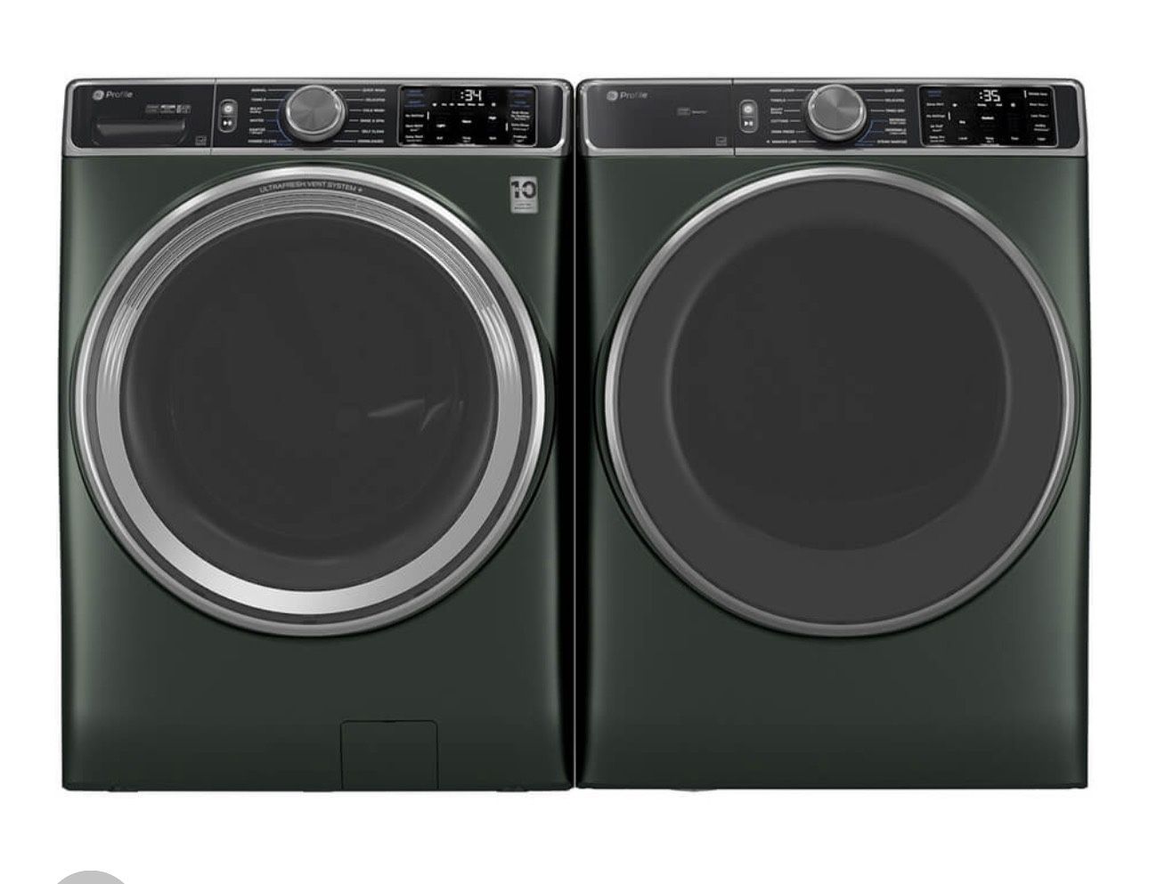 BRAND NEW GE PROFILE WASHER AND DRYER IN THE BOX COLOR GREEN Profile 7.8 cu. ft. Capacity Vented Smart Front Load Gas Dryer in Green with Quick Dry plus Steam and Sanitize Cycle Profile 5.5 cu. ft. Capacity Smart Front Load Washer with UltraFresh Vent System Plus, PowerSteam, Smart Wash Plus Rinse UltraFresh Vent System+ with OdorBlock - The first and only UltraFresh Vent System+ is enhanced with a sensor that detects and eliminates excess moisture to help prevent odors, ensuring your washer stays fresh and clean Microban Antimicrobial Technology - Get protection that lives on load after load with antimicrobial technology built into components including the gasket, dispenser, and draining system. The Largest Front Load Washing Capacity* - *Among front washing machines 28" wide or less Smart Wash & Rinse - Through AI technology, sensors measure soil and detergent levels throughout the cycle and during the rinse to optimize wash and rinse times, deliver better fabric care and ensure a thorough clean. SmartHQ Assistant - In the SmartHQ App, you can input voice or text commands based off the type of fabric and stains you are washing and SmartHQ Assistant will give you expert recommendations and automatically set your machine for optimal results Adaptive SmartDispense - Save time and effort with a dispenser that holds enough detergent for up to 32 loads. Plus, scan the barcode on the detergent bottle with the SmartHQ app and the washer will dispense the right amount based on the type of detergent.