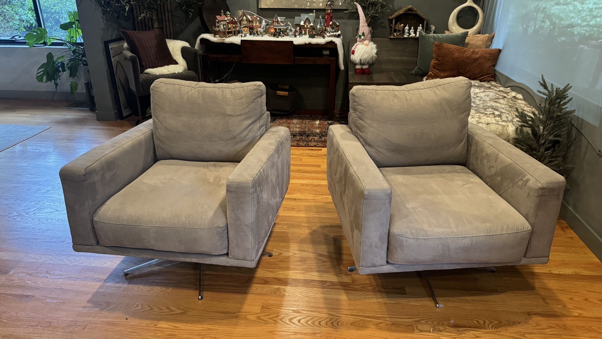 Pair of BoConcept swivel chairs with removable cushions barely used! Designer: BoConcept Color: Gray Material: Microfiber 360 - Swivel 31”D x 30”W x 34”H Can be converted back to 4 legs as well. I do not have the legs though. Base