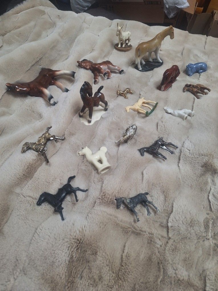 17 Assorted horse figurines with some in unusual poses, some say Japan most say nothing plus one donkey all for 25 bucks... Great addition to your horse lovers collection ...