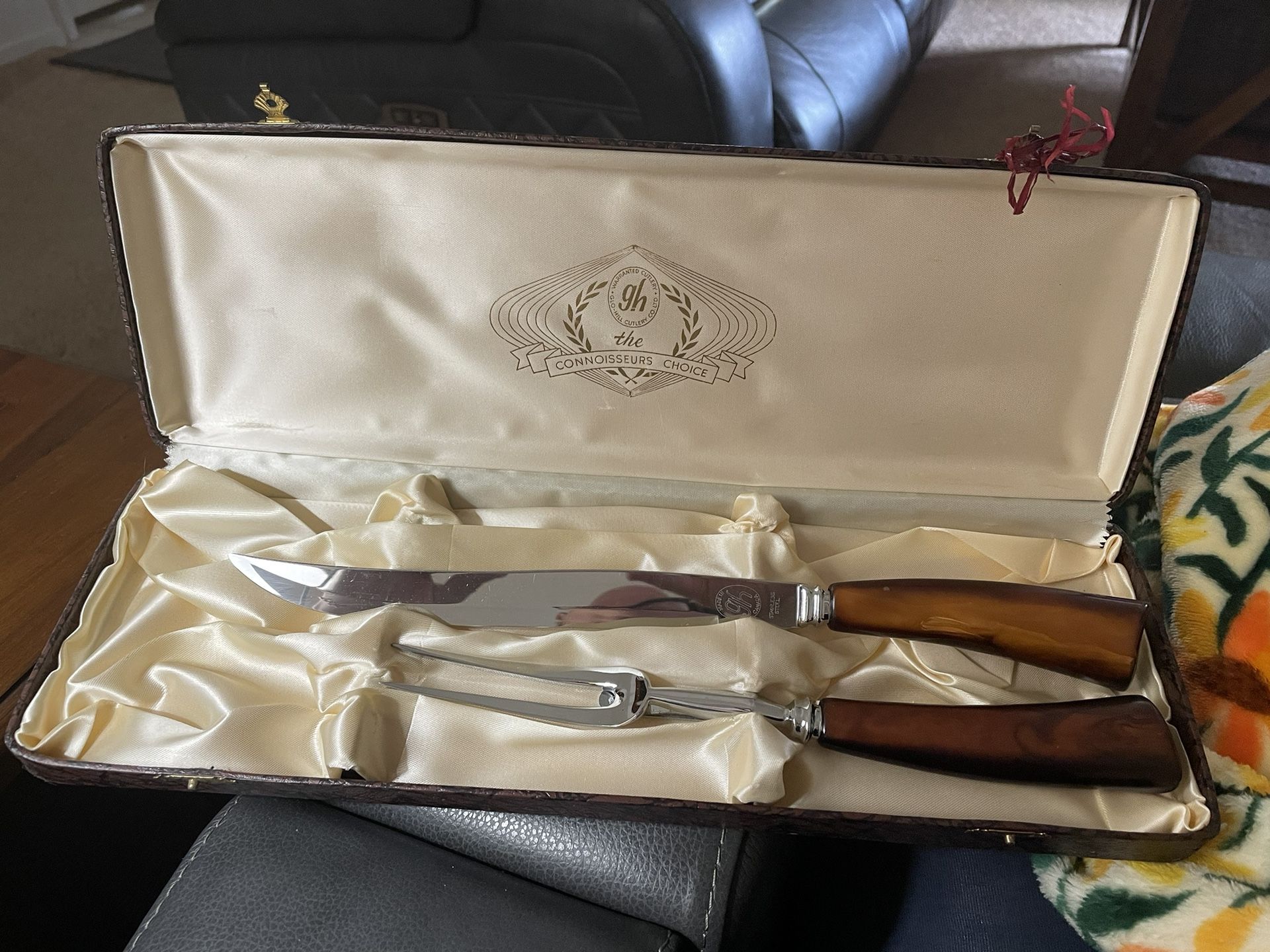 Vintage GLO HILL The Connoisseurs Choice carving knife set in box Sheffield England bakelite handles carving knife fork stainless steel