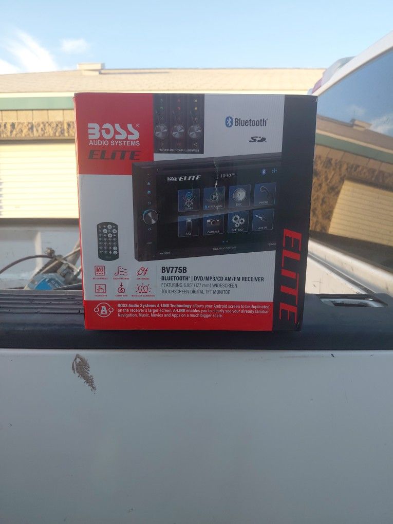 Looking to modernize your car’s dashboard? This BOSS Audio Elite BV775B is a feature-packed double-DIN powerhouse that brings smartphone tech and high-quality entertainment to your fingertips. ✨ Top Features You’ll Love: Massive 6.95” Touchscreen: A crystal-clear, responsive widescreen display that makes navigating your music and apps effortless. Android A-LINK (Screen Mirroring): Mirrors your Android phone screen directly onto the unit. Use your favorite Navigation (Google Maps/Waze), watch movies, or browse apps on a much larger scale. Hands-Free Bluetooth: Stay safe with wireless calling and seamless audio streaming for Spotify, Pandora, and Apple Music. Multi-Media Support: Whether you prefer digital or physical, this does it all. Plays DVDs, CDs, MP3s, USB, and SD cards. Custom Look: Features Multi-Color Illumination so you can match the buttons to your car’s interior lighting. Powerful Sound: Built-in 320W amplifier (80W x 4) with preset EQ for a massive audio upgrade over factory stereos. 🔧 Connectivity & Safety: Backup Camera Input: Ready for a rear-view camera to make parking a breeze. Steering Wheel Control (SWC): Compatible with your factory steering wheel buttons (adapter required). Pre-Amp Outputs: Front, Rear, and Subwoofer outputs if you want to add external amps. Condition: BRAND NEW IN BOX