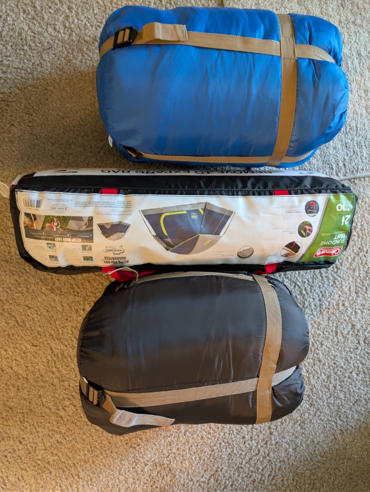 Camping bundle: Coleman Sundome 2-person tent + 2 sleeping bags. Great starter setup for camping, festivals, or guests. Tent is easy to set up and comes in the original carry bag. Everything is in good condition and ready to use.