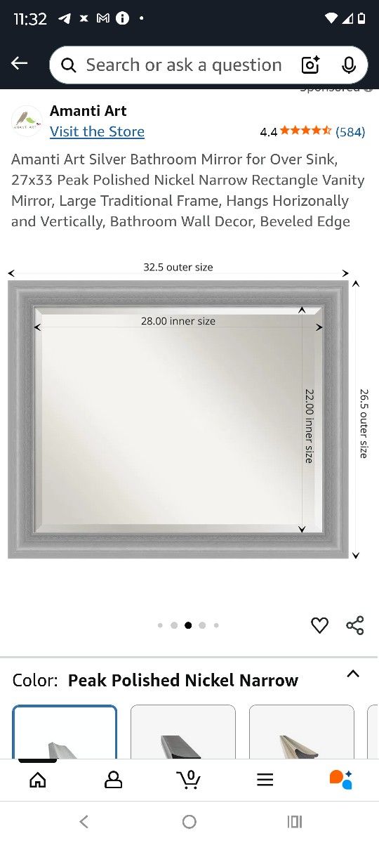 Open Box .Amanti Art Silver Bathroom Mirror for Over Sink, 27x33 Peak Polished Nickel Narrow Rectangle Vanity Mirror,$154 Retail