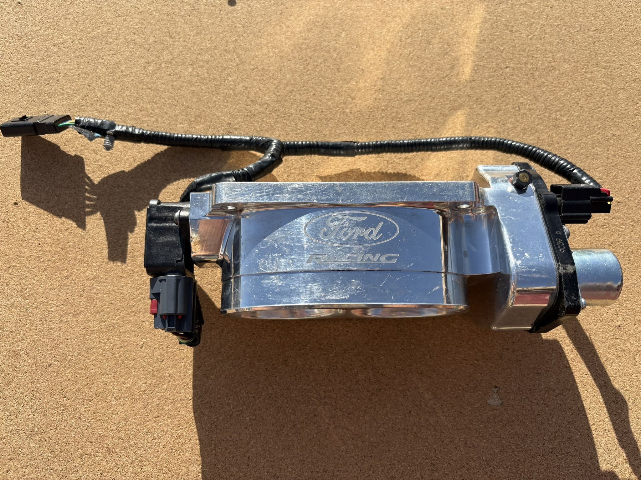 Shiny Ford Racing dual throttle body. Part number M-9926-J65. Has the wiring harness attached.