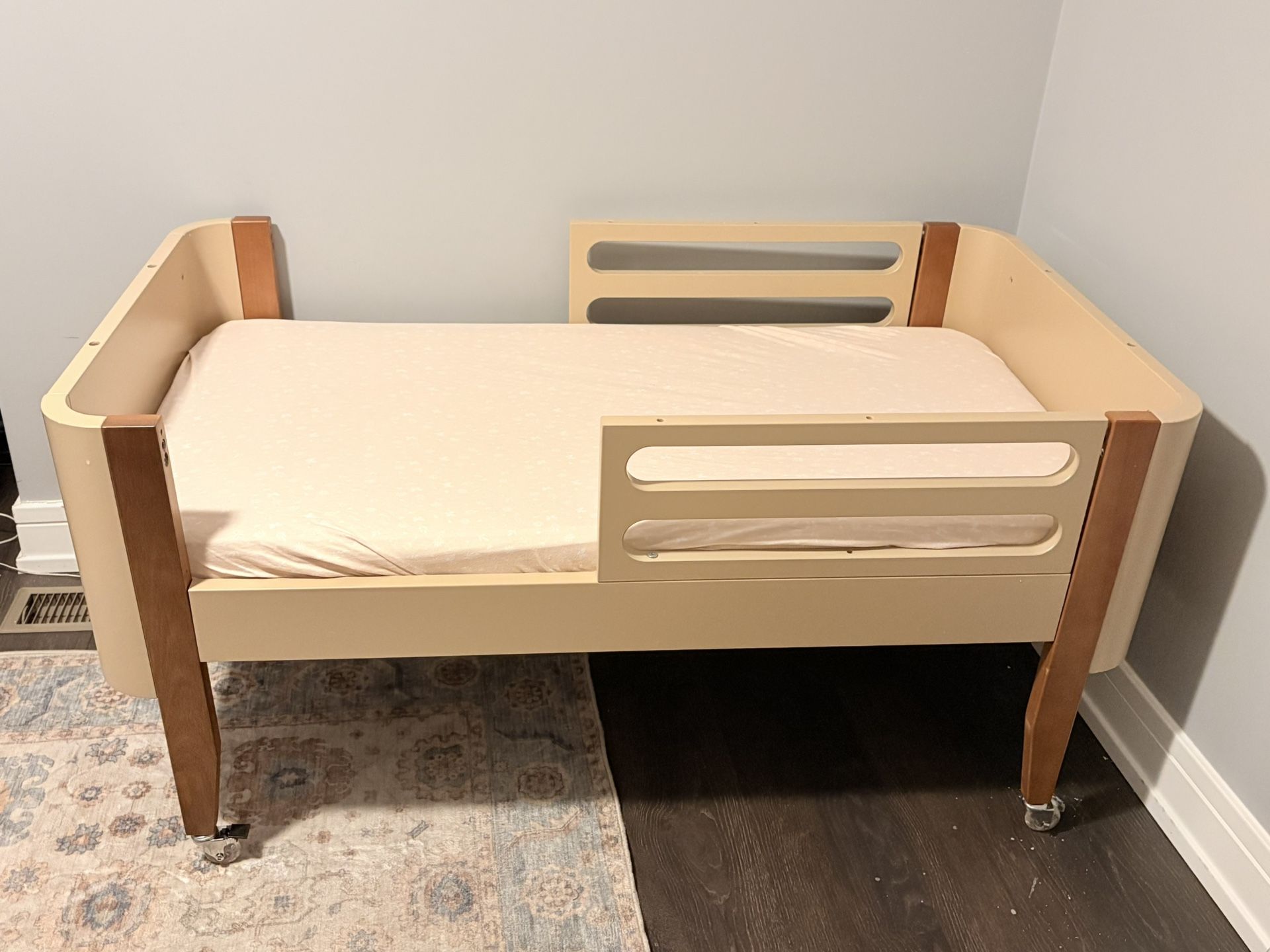 Normal wear from use. Currently set up as a toddler bed; can be converted into a bassinet or crib. All pieces are included. Pickup only since it is already assembled.