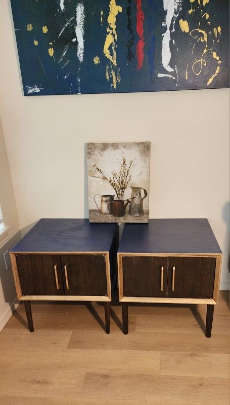 Refurbished Mid-Century Modern pair of nightstands / end tables / record stands. 22h x 22w x 24d. Deep navy blue with gilded highlights. They are relatively light and can fit in any car. One leg is ever so slightly wobbly but doesn't inhibit function.