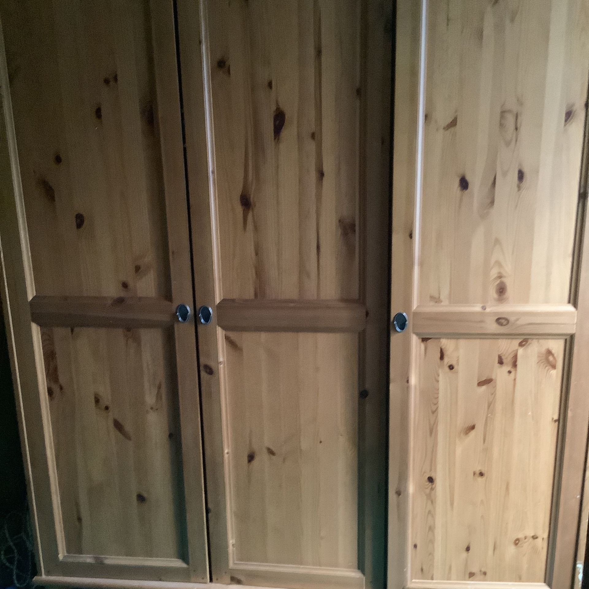 Three door closet with shelves Dresser with four full drawers and two small top drawers Bookshelf with four shelves