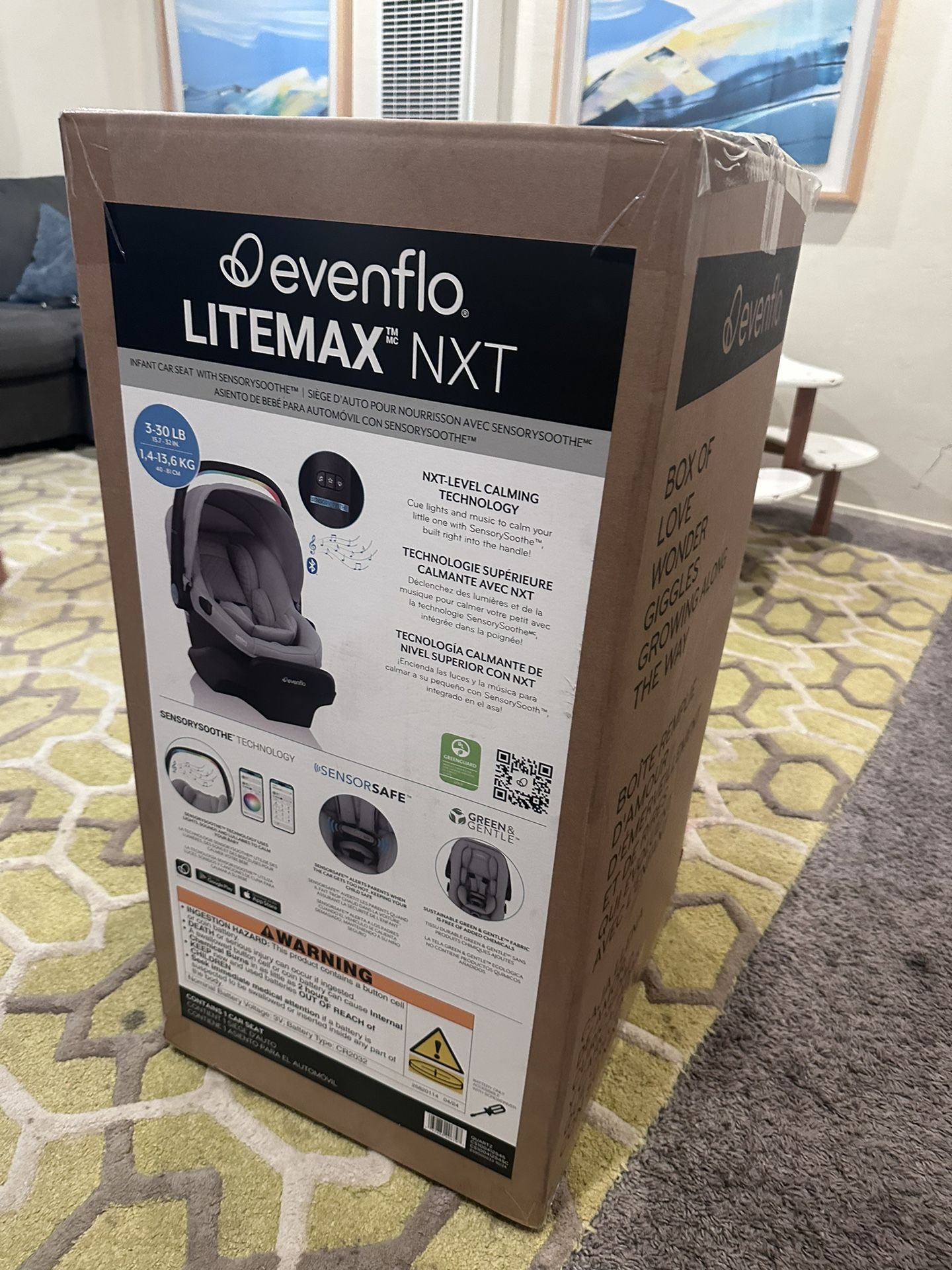 Introducing the Evenflo® LiteMax™ NXT Infant Car Seat with SensorySoothe™ technology. You’ve never seen anything like this! SensorySoothe technology engages and calms your baby with lights, music and sounds integrated into the infant car seat handle. Cue a mesmerizing light show with music via the Evenflo app on your mobile device! LiteMax NXT accommodates infants 3 to 30 lb (15.7 in. to 32 in. tall). Integrated SensorSafe® technology adds a layer of protection, alerting you in real-time via Bluetooth® to 4 potentially unsafe conditions from your child’s car seat: unsafe ambient temperature, child unattended, child buckled too long, and unexpected chest clip unbuckling. LockStrong™ belt tensioning system provides solid, secure installation in no time. Looking for a more sustainable car seat? LiteMax NXT’s plush, environmentally friendly Green & Gentle™ Fabric is woven from recycled plastic bottles, free of added chemicals and added flame retardants — a choice you can feel good about. GREENGUARD® Gold Certified for meeting low chemical emissions standards to create a healthier environment for your child. Compatible with SafeZoneTM Load Leg accessory (sold separately), an adjustable support leg with easy-to-read indicators that helps stabilize the car seat base by limiting rotation and reducing crash forces. LiteMax NXT meets or exceeds all applicable Federal Safety Standards as well as federal side impact standards effective in June of 2025. Additionally, it is structural integrity tested, rollover tested and temperature tested. If you need help installing your car seat, our ParentLink® Consumer Care Team offers help online in real time. Get live video support with a certified car seat safety technician to assist with proper vehicle installation, so you can drive with confidence. Families have trusted Evenflo for more than 100 years for smart, innovative gear designed to make life easier, safer and more comfortable at home and on the go. Let us help you save time and find peace of mind, so you can focus on what matters most: your child.