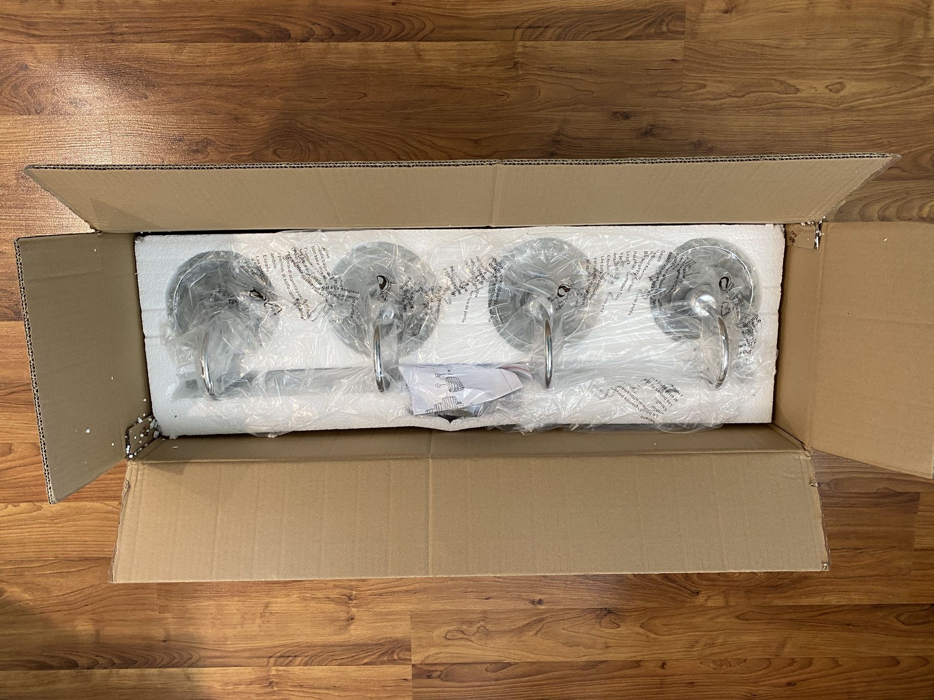 New Open Box Bathroom Vanity 4 Globe Light. Chrome finish. Never used. Approximately 30” wide at mounting rail. Maybe 35” wide globe to globe. I found it online for now for $131.55. I’ll sell it for $75.00.