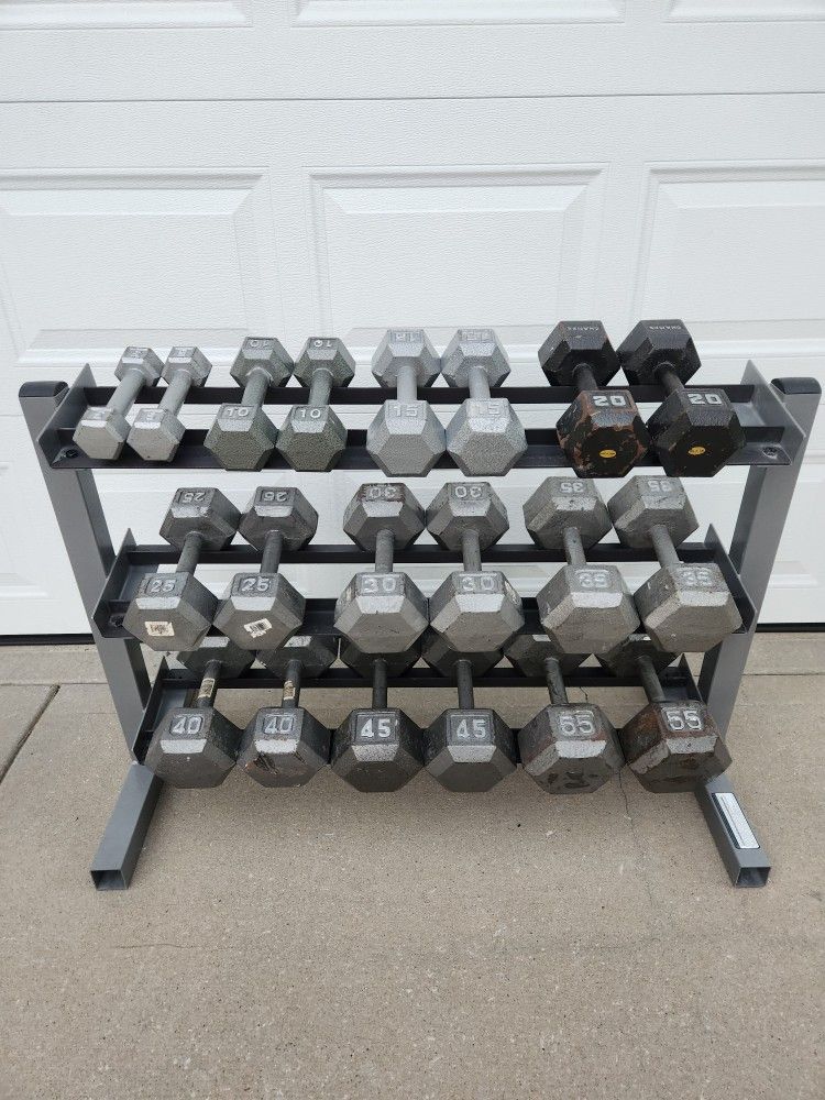 Nice iron hex dumbbell set! 560lb set includes: 2 - 5lb Iron Hex Dumbbells 2 - 10lb Iron Hex Dumbbells 2 - 15lb Iron Hex Dumbbells 2 - 20lb Iron Hex Dumbbells 2 - 25lb Iron Hex Dumbbells 2 - 30lb Iron Hex Dumbbells 2 - 35lb Iron Hex Dumbbells 2 - 40lb Iron Hex Dumbbells 2 - 45lb Iron Hex Dumbbells 2 - 55lb Iron Hex Dumbbells 1 - Body-Solid 3-Tier Dumbbell Rack GDR363 First $700 cash takes them all! Package deal only, delivery available. I also have other rubber and neoprene dumbbells, Olympic plates, Olympic bars, kettlebells, standard sized plates, bars, racks, benches, exercise bikes, treadmills, commercial equipment, etc. just look at my other items or send me a message about them.