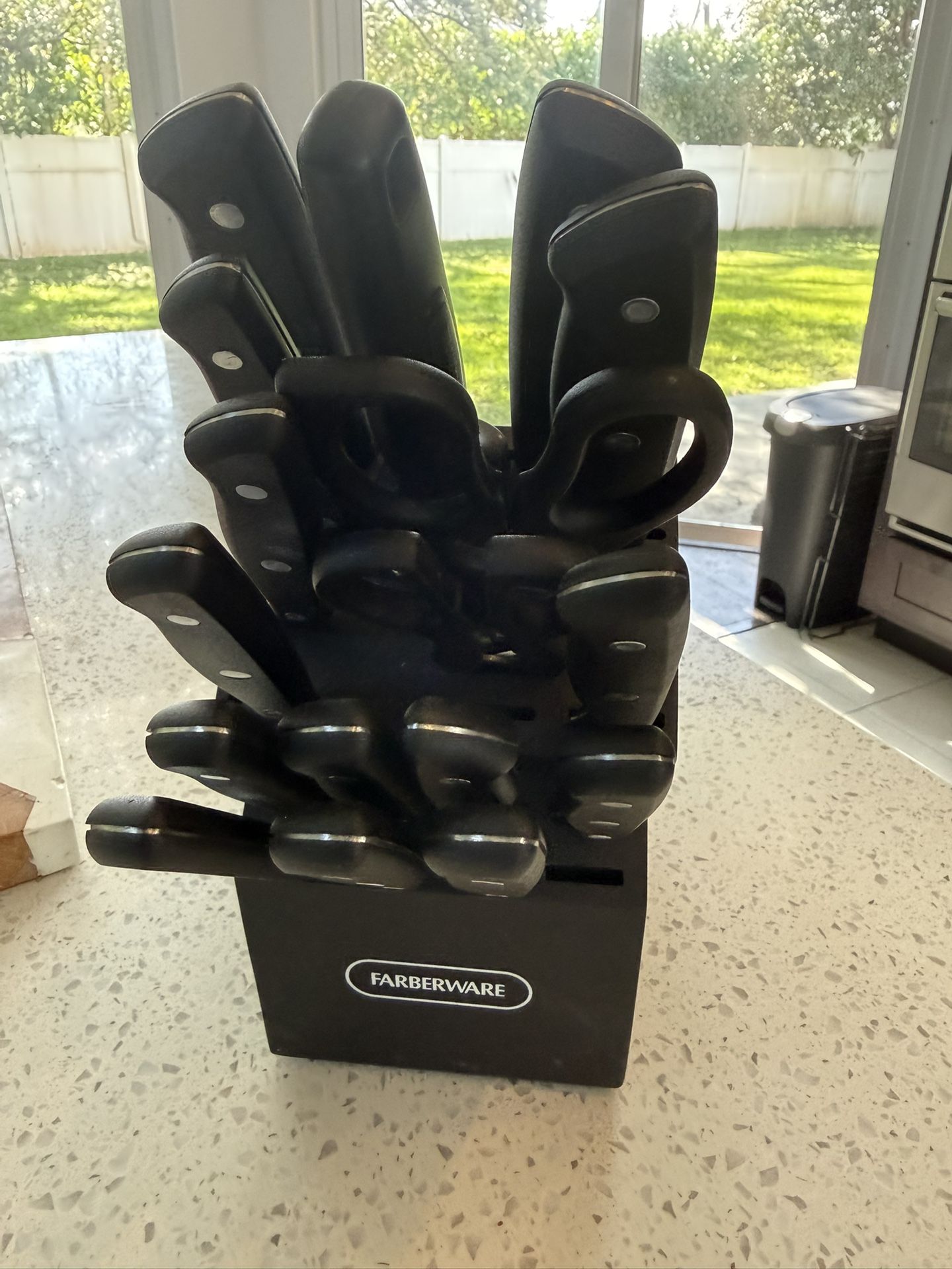 Faberware 17-Piece Steel Knife Block And Kitchen Tool Set. Good for those who know their way around the kitchen. Never needs sharpening blades. Dicing, chopping and slicing. Missing two steak knives. In excellent condition.