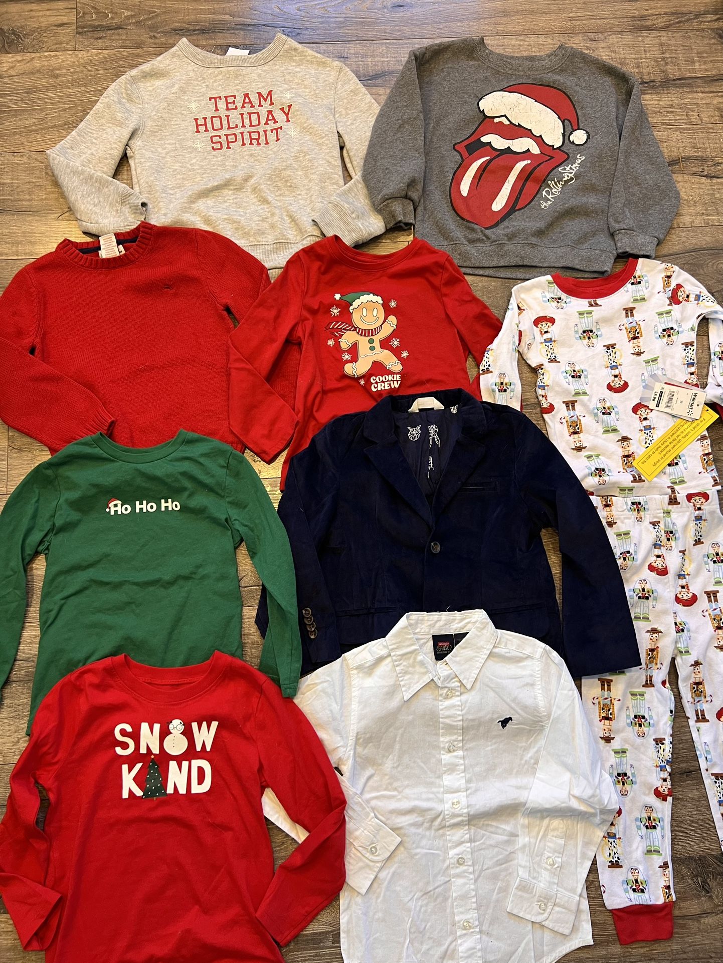 1 pair of Toy Story pajamas NWT 1 button down white shirt by wrangler 1 dress coat by genuine kids Oshkosh 1 shirt by garanimals 2 shirts by holiday time 1 sweater by Tommy Bahama 1 sweater by the Rolling Stones 1 sweater by wondershop