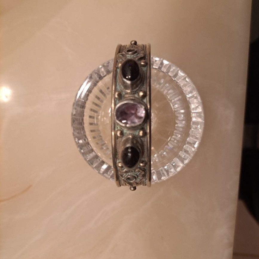 I'm just not sure what kind of stones are in this one but sure is one of a kind solid silver ONE LOOKS LIKE AMETHYST / THE OTHER TWO are DARK RED STONES they are garnets just found out...