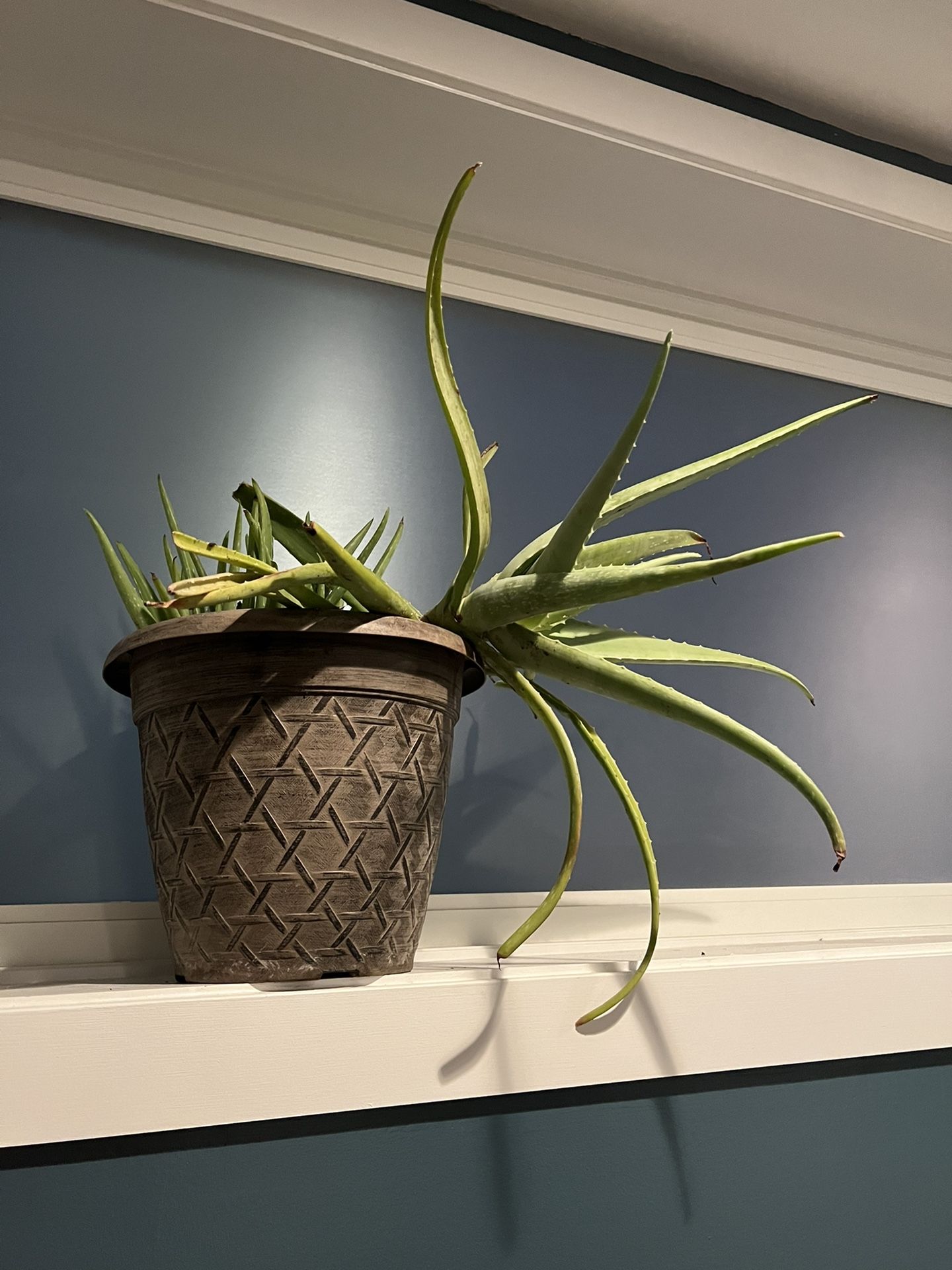 Huge aloe plant in 5 gallon pot. About 10 pups sprouting in there as well