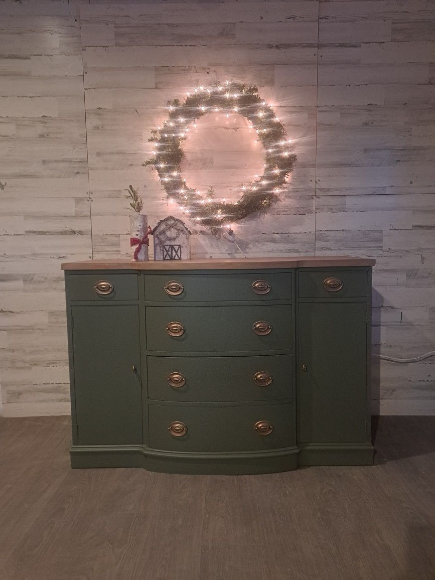 Newly refinished beautiful mahogany buffet that has been painted in an Olive green and the top was stripped to show off the wood grain with three coats of waterproof poly added for protection. All drawers open and close smoothly. Each cabinet has a built in shelf for plenty of storage. The dimensions are 52w×21d×35h. Free curbside delivery when paying full price within 30 miles of Villa Park.
