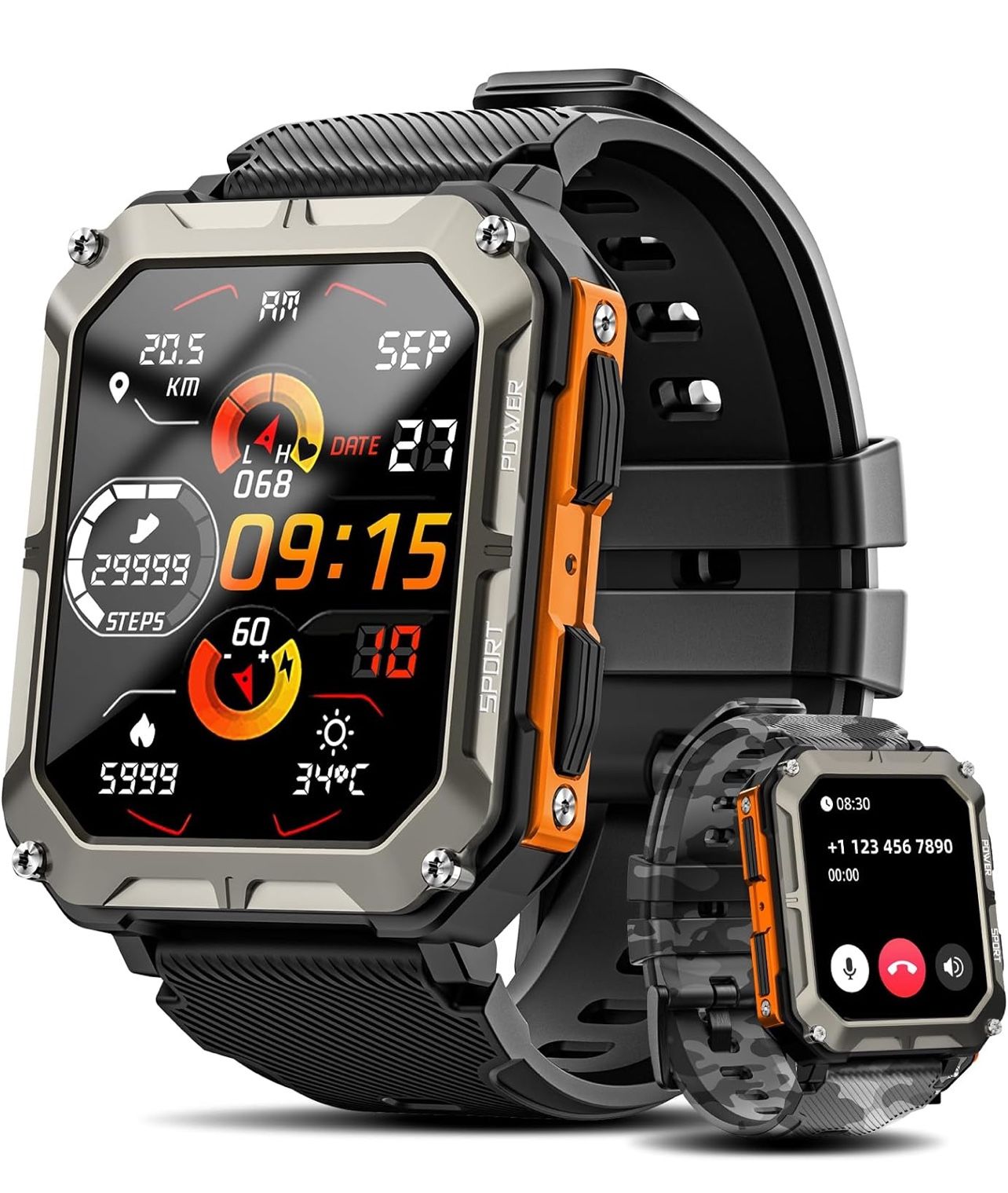 New in sealed box Sells for $56 new on Amazon STURDY BODY SPECIFICALLY BUILT FOR MEN--The tactical smart watch has passed 12 military-grade tests, is made of a micro-blasted metal frame and titanium body, renders it highly resistant to vibration, drop and car-crushing. The running watch with a high strength tempered glass that is scratch and wears resistant without the need for a protective film, allows you to be more active outdoors, enduring tough conditions SINGLE SWITCH TO BLUETOOTH CALLING--The military smart watches harvest the latest chip processor with single-mode Bluetooth. On connecting the APP Da Fit, you can make phone calls via Bluetooth and play music on your wrist, built-in high-fidelity speakers make the sound clearer. You can receive message reminders on your watch, such as Facebook, Twitter, Skype, WhatsApp, Instagram, SMS, etc.(The sport smart watch is compatible with most smartphones with Android system 6.0 & iOS 9.0 or above) AN EVER-READY HEALTH MONITOR--Rgthuhu blood pressure watches for men harnesses the leading high-precision sensors, can effectively test the heart rate of dark skin users, support blood oxygen tests, double health monitoring to make exercise safer and more controllable. When you sleep, the Android smart watch begins to track your sleep data, recording the length of your deep sleep, light sleep and REM. It awards a score on your overall sleep quality, helps you understand your sleep habits DESIGNED FOR OUTDOOR AND INDOOR SPORTS--The pedometer smart watch supports 120+ sports modes, it can track your calories, steps and distance, you can easily customize and change up your routine. The rugged men's exercise smartwatch has got through IP69K rating test, with static waterproof to 100m, you can wear it for all day-to-day water sports and activities, such as swimming, diving, surfing YOUR PERFECT PARTNER--This fitness watches are equipped with 128M memory, offers efficient data processing and supports more application tools, such as weather, stopwatch, alarm clock, music control, camera control, calculator, voice control, sedentary reminder, drink water reminder, etc., which provides more convenience to life. It is a great choice for your father, husband, family and friends NOTE--【Smartwatch health data cannot be used for medical purposes (not to be compared with medical devices) and is for exercise reference only. Smartwatch health data cannot be used for medical purposes (not to be compared with medical devices) and is for exercise reference only. 】