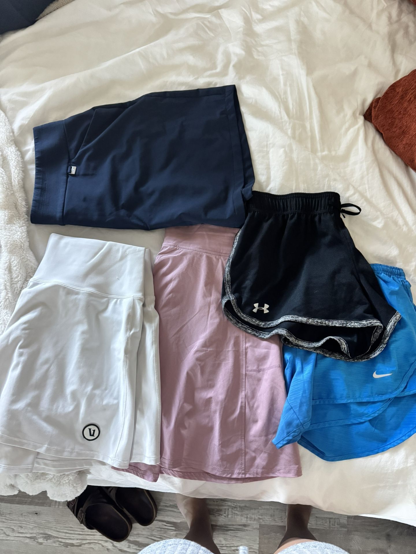 Nice bundle of skorts and 2 pairs of athletic shorts. Brands include Nike, Under Armor, Vuori and more. All in great shape and lightly used, they no longer fit. Sizes ranging from L-XL. Athletic shorts run small.