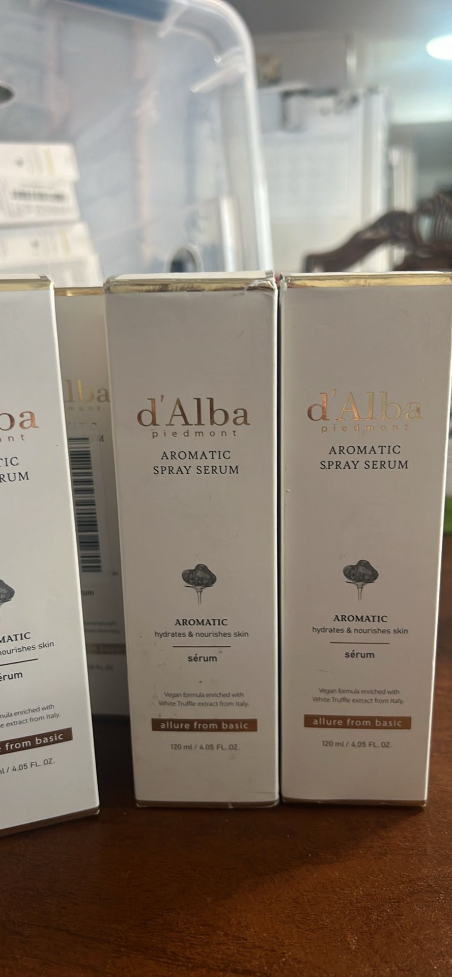 The image shows the d'Alba Piedmont Italian White Truffle First Aromatic Spray Serum. This spray serum is known for its hydrating and elasticity-boosting properties, containing Italian white truffle extract and Vitamin E (Trufferol™). It is a vegan formula, certified by the Italian V-label, and is also hypoallergenic, making it suitable for sensitive skin. The product can be used as a toner, a refreshing mist, or even a setting spray for makeup, offering versatile hydration and a soothing finish. It is available in various sizes, including the 120ml/4.05 fl. oz. size shown in the image 10 available