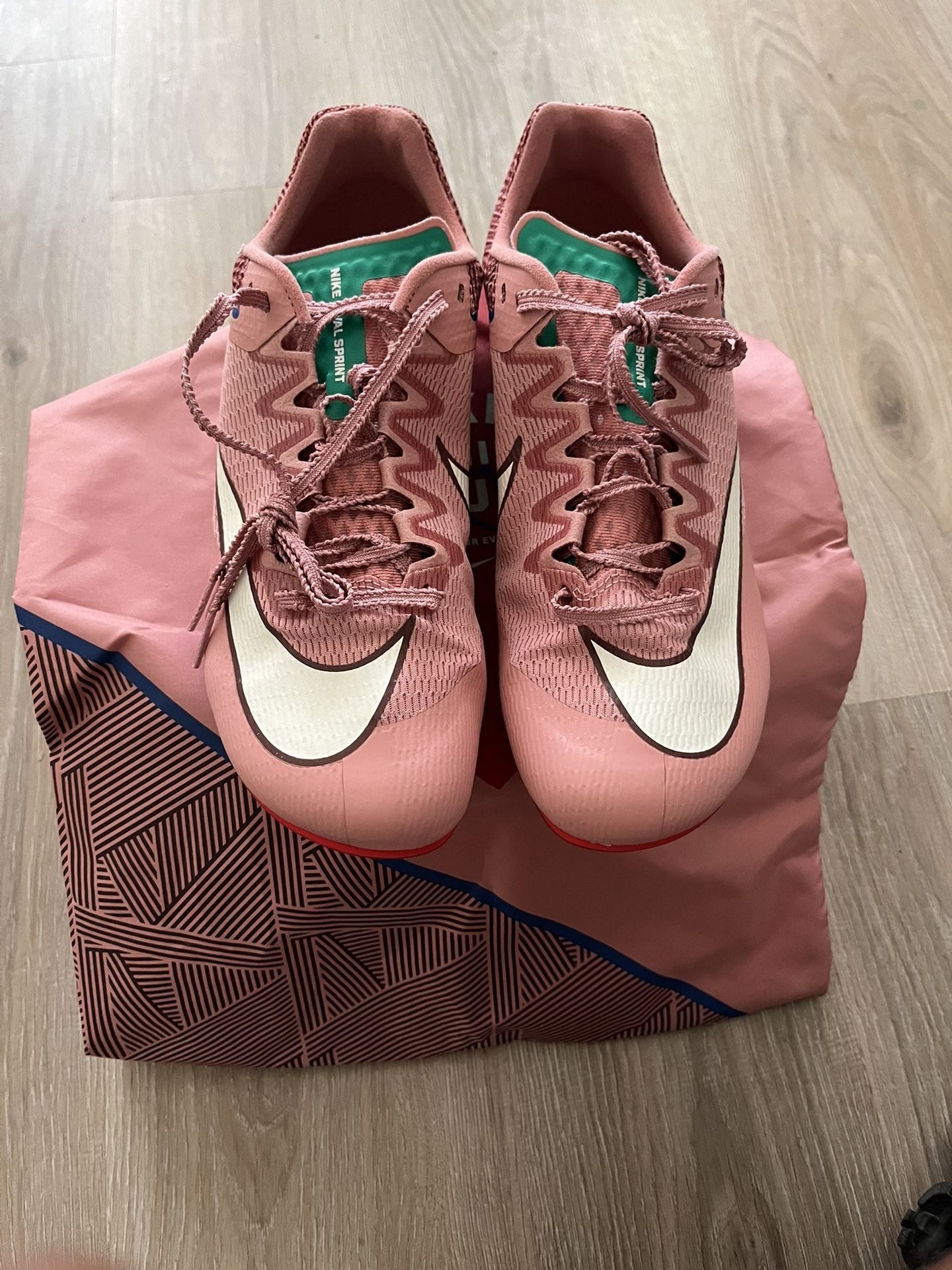 Don’t know a lot about spikes but these come with no box and are size 8.5 and comes with spikes to put them on on and has never been used before