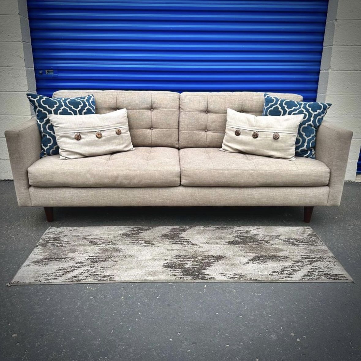Selling My Beige Mid Century Modern Tufted Sofa. Comfortable Back and Seat Cushions, Smooth Fabric, Tufted Seat and Back, Clean. Excellent Shape. Original Condition. Made by Greathouse Furniture. Dimensions: 87in Long, 36in Wide, 18in Seat Height, 34in Tall Backrest. Pickup in 92109 or Delivery with Zipcode.