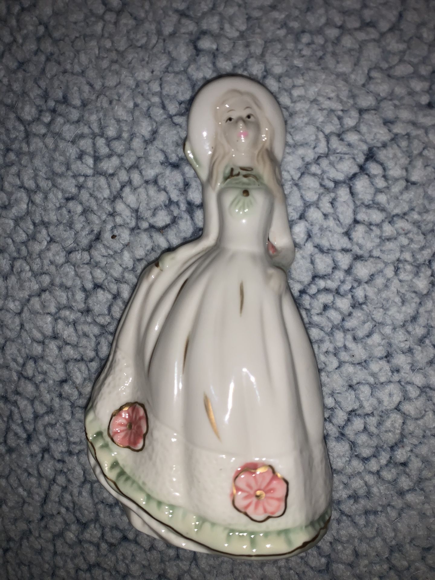 Vintage Porcelain Woman Lady Figurine Statue Southern Belle in large rimmed hat and White Dress with pink flowers and pink ribbons and gold accents. Bottom of dress is textured and has a green ruffle effect at bottom. Made in Royal Doulton Style. She is unmarked for her maker. Nice piece! No chips or cracks. Excellent used condition. About 7” x 3”