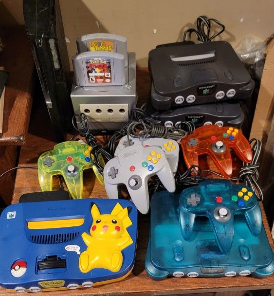 Huge Game System Lot! 2-N64 1-N64 Ice Blue 1-N64 Pikachu edition 1-Playstation 1. 1 Playstation 2 2-PS2 Slim. Gamecube with Gameboy Adapter (no disc) 1 SNES Classic. 2- Xbox One S 2-n64 games, 5 GBA Games Pokemon Sun & Moon. Pokemon Red 8-Gamecube games (no covers, in pouch) Playstation 1 Final Fantasy VII, XIII, IX. Tekken 3, Tony Hawk Pro Skater 2 4 Xbox 360 Slim (As is) plus various extra controllers fur n64, Xbox 360 Only sold as a lot. Will not part out.