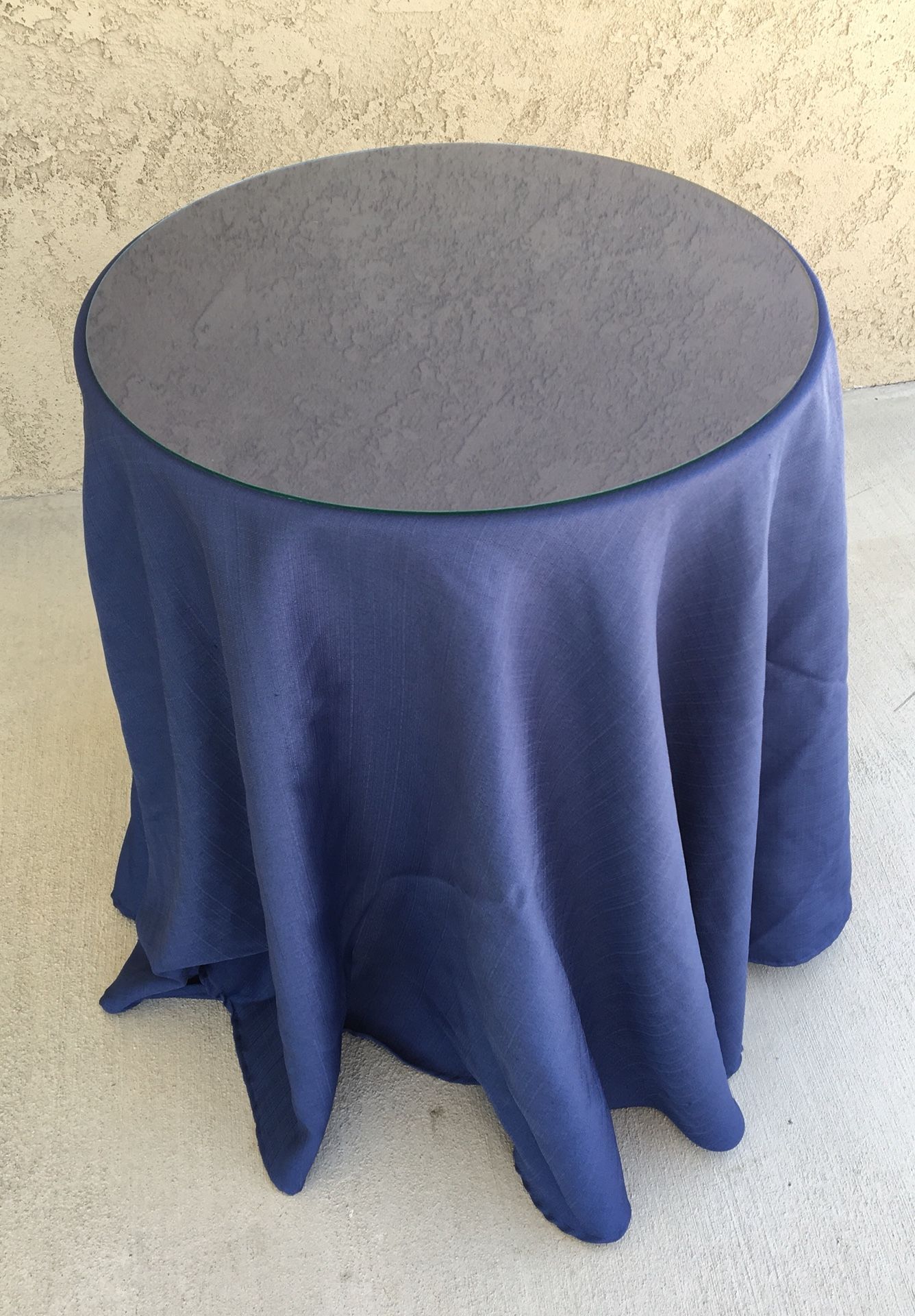 Nice little wooden 3 leg table (legs will unscrew for storage)... comes with glass top and blue table cloth cover - $20 OBO