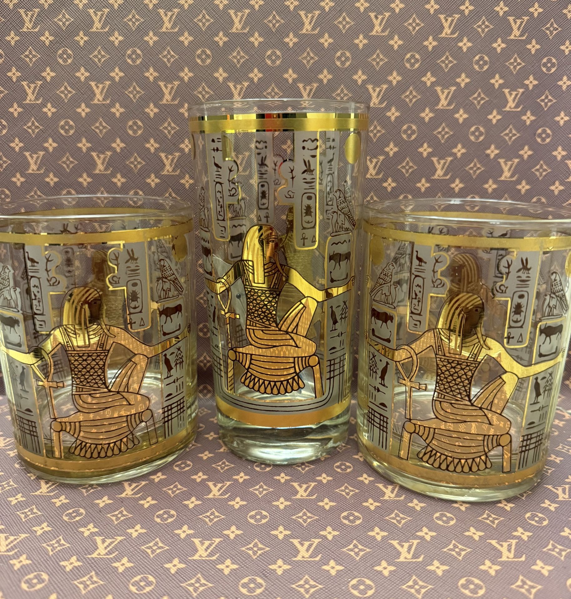 CULVER Set of 3 Egyptian Pharoah Double Old Fashioned 22K Gold & Etched Glass