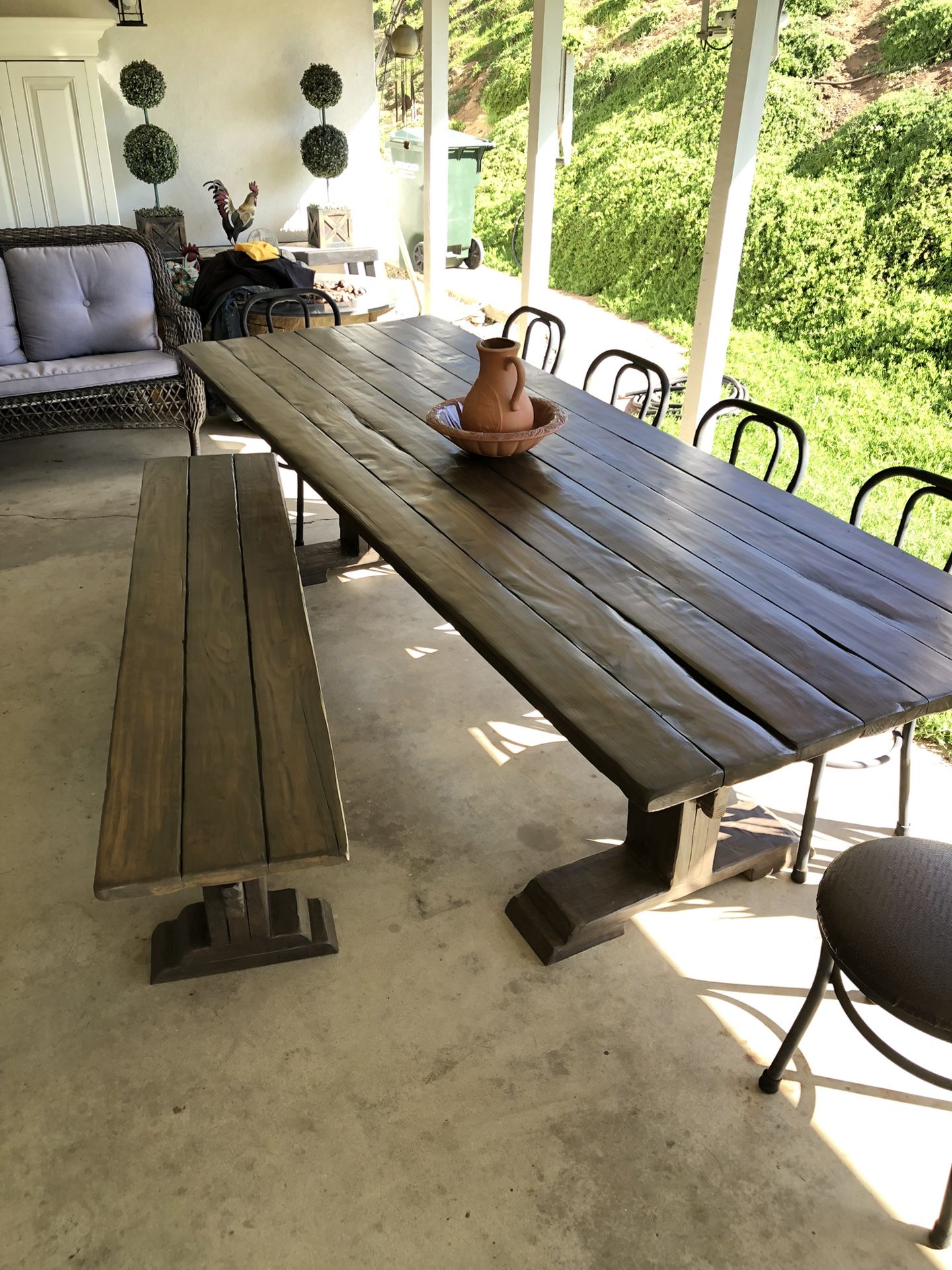 Price Includes Delivery 9 Foot Long 38” wide Seats 10 Handcrafted Solid Wood Rustic Pioneer Design Single Trestle Antique Mission Styling Finished for Outdoor use Matching Bench 80 long Full 16 inch wide seat *chairs not included