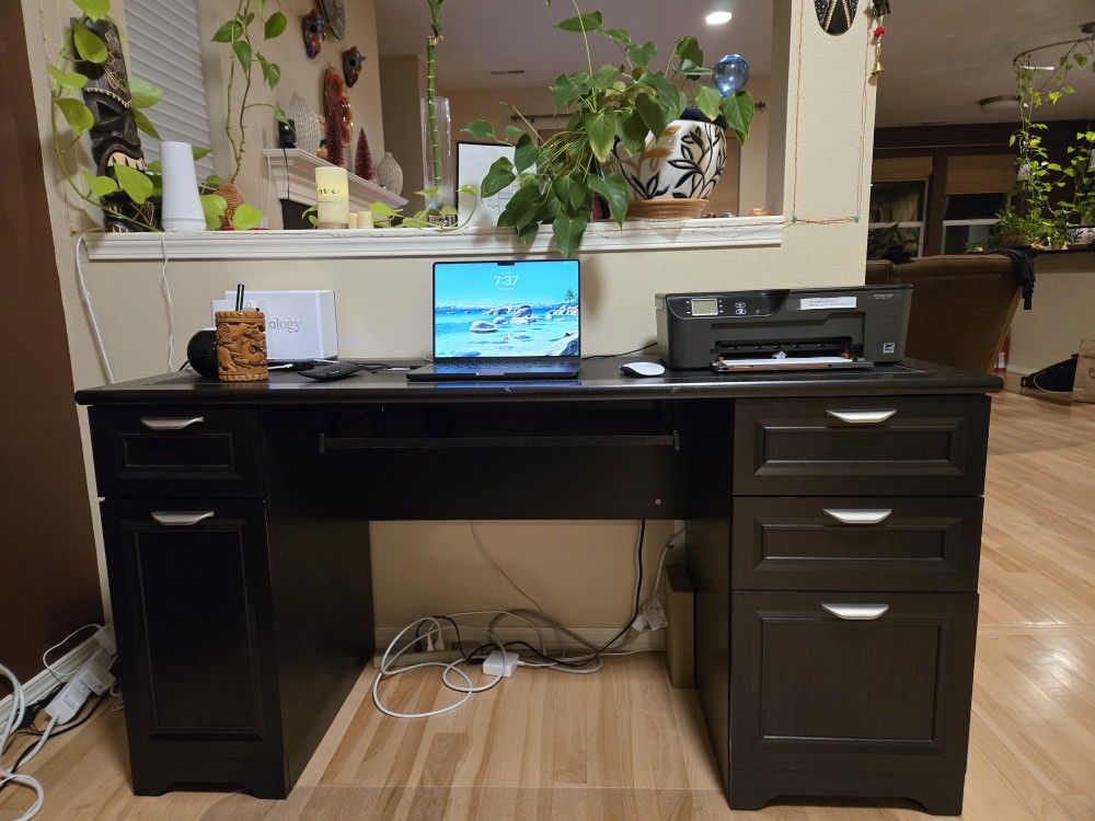 Office Desk with Storage and Chair for sale. Storage includes a File Cabinet (bottom right). The writing surface is faux leather , also includes a Keyboard pullout. Dimensions - 59 L * 23 W * 30 H