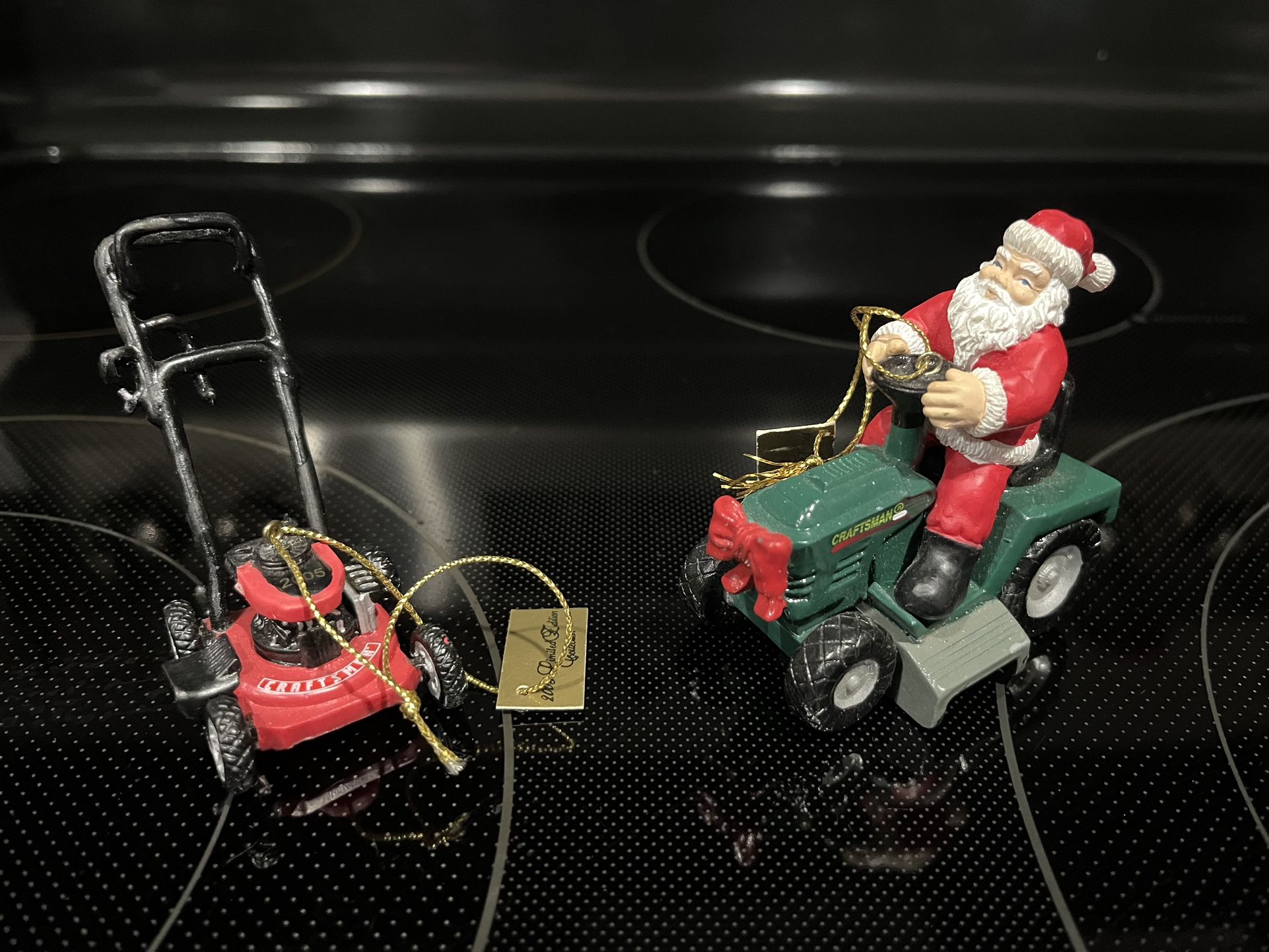 The one of Santa on the craftsman lawnmower, the tag says Mr. Christmas, 1997 Limited edition collection The one of the craftsman lawnmower the tag says 2005 Limited edition collection