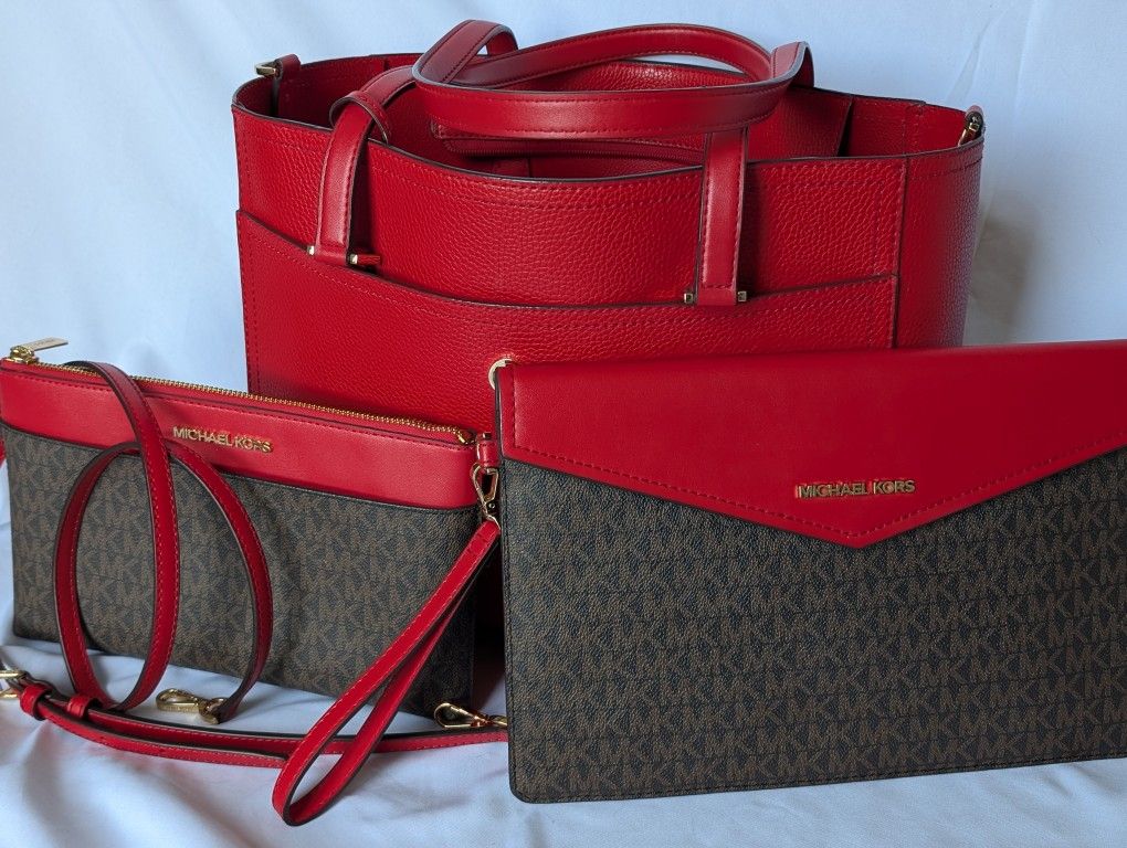 Beautiful Michael Kors purse with matching clutch + crossbody included. • Clean interior and exterior • Minimal wear • Stylish red and brown MK design • Perfect for everyday use or special occasions Selling as a set. Smoke-free home. Message me if interested!