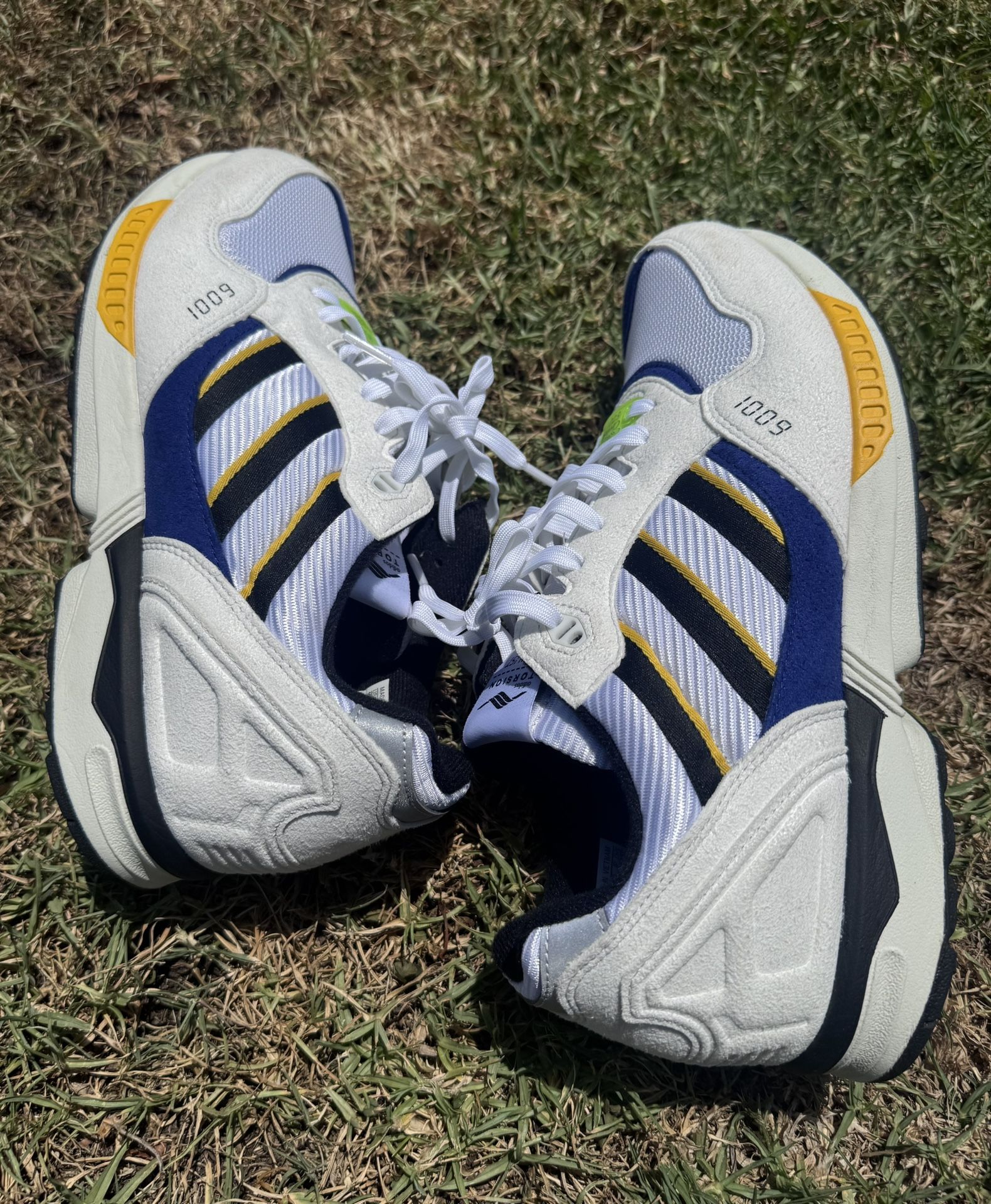 These particular sneakers feature a white leather and mesh upper with bold blue and yellow accents, along with the iconic three stripes in a striped pattern.