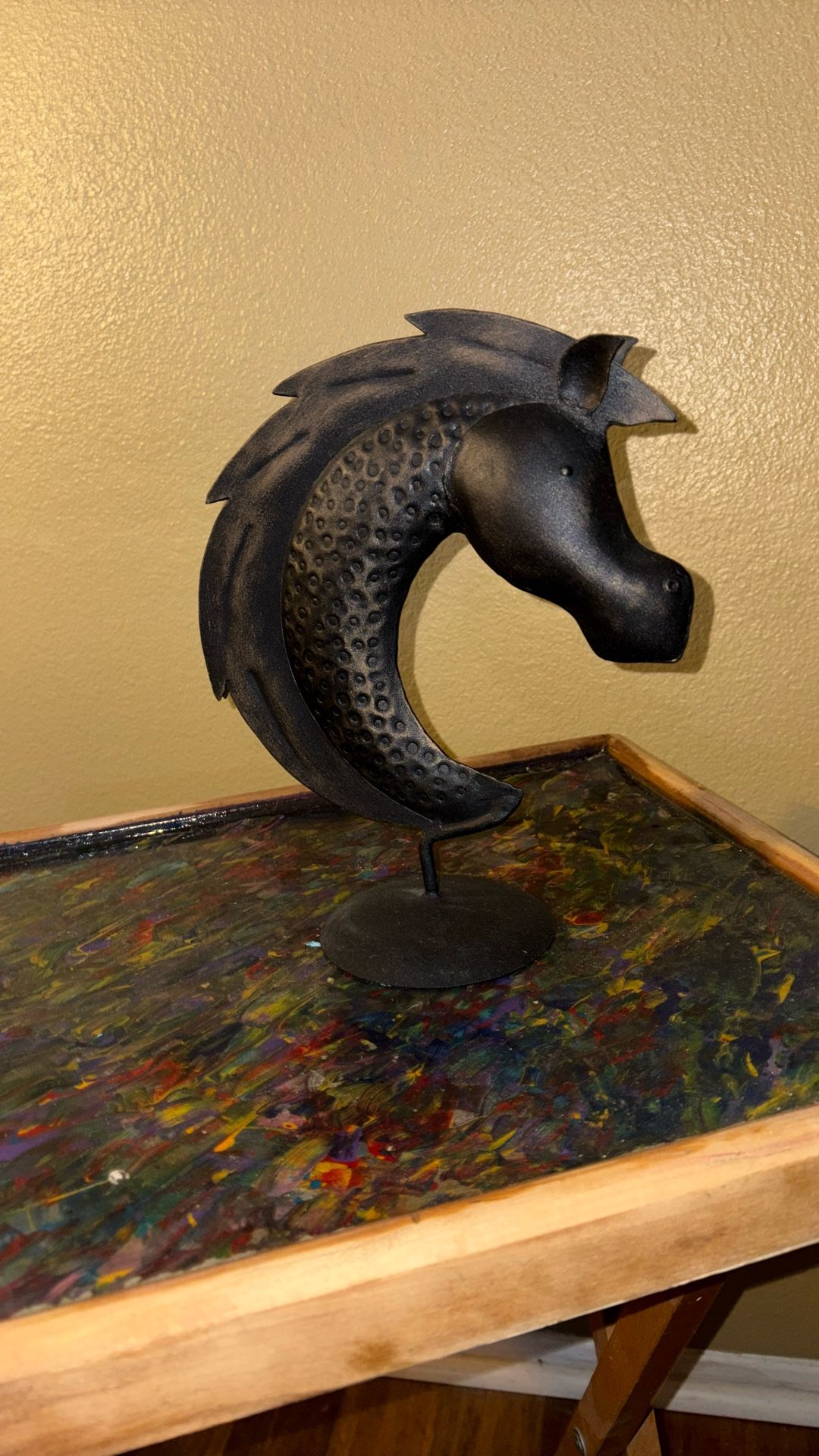 It’s a metal round shaped horse head statue. It’s in perfect condition.